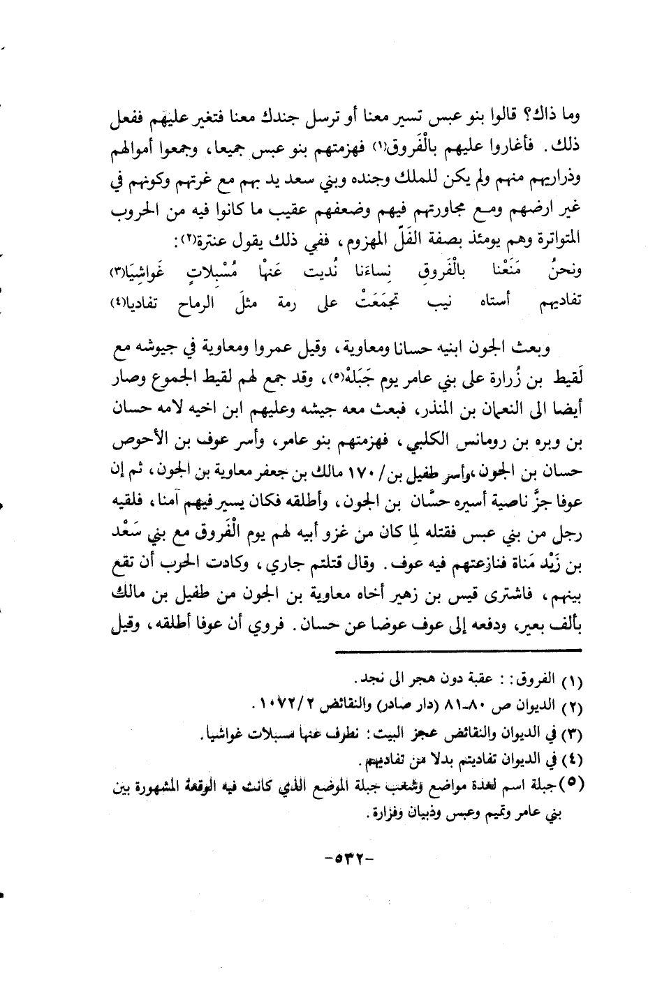 وما ذاك؟ قالوا بنو عبس تسير معنا أو ترسل جندك معنا فتغير عليهم ففعل ذلك. فأغاروا عليهم بالفروق فهزمتهم بنو عبس جميعا وجمعوا أموالهم وذراريهم منهم ولم يكن للملك وجنده وبني سعد يد بهم مع غرتهم وكونهم في غير أرضهم ومع مجاورتهم فيهم وضعفهم عقيب ما كانوا فيه من الحروب المتواترة وهم يومئذ بصفة الفلّ المهزوم ففي ذلك يقول عنترة: