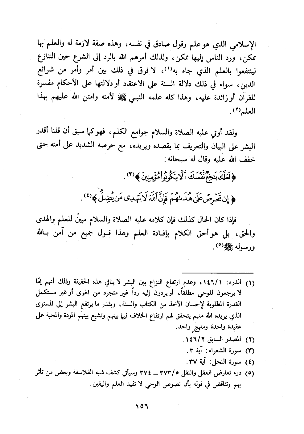 (٥) درء تعارض العقل والنقل ٥/ ٣٧٣ - ٣٧٤ وسيأتي كشف شبه الفلاسفة وبعض من تأثر بهم وتناقض في قوله بأن نصوص الوحي لا تفيد العلم واليقين.