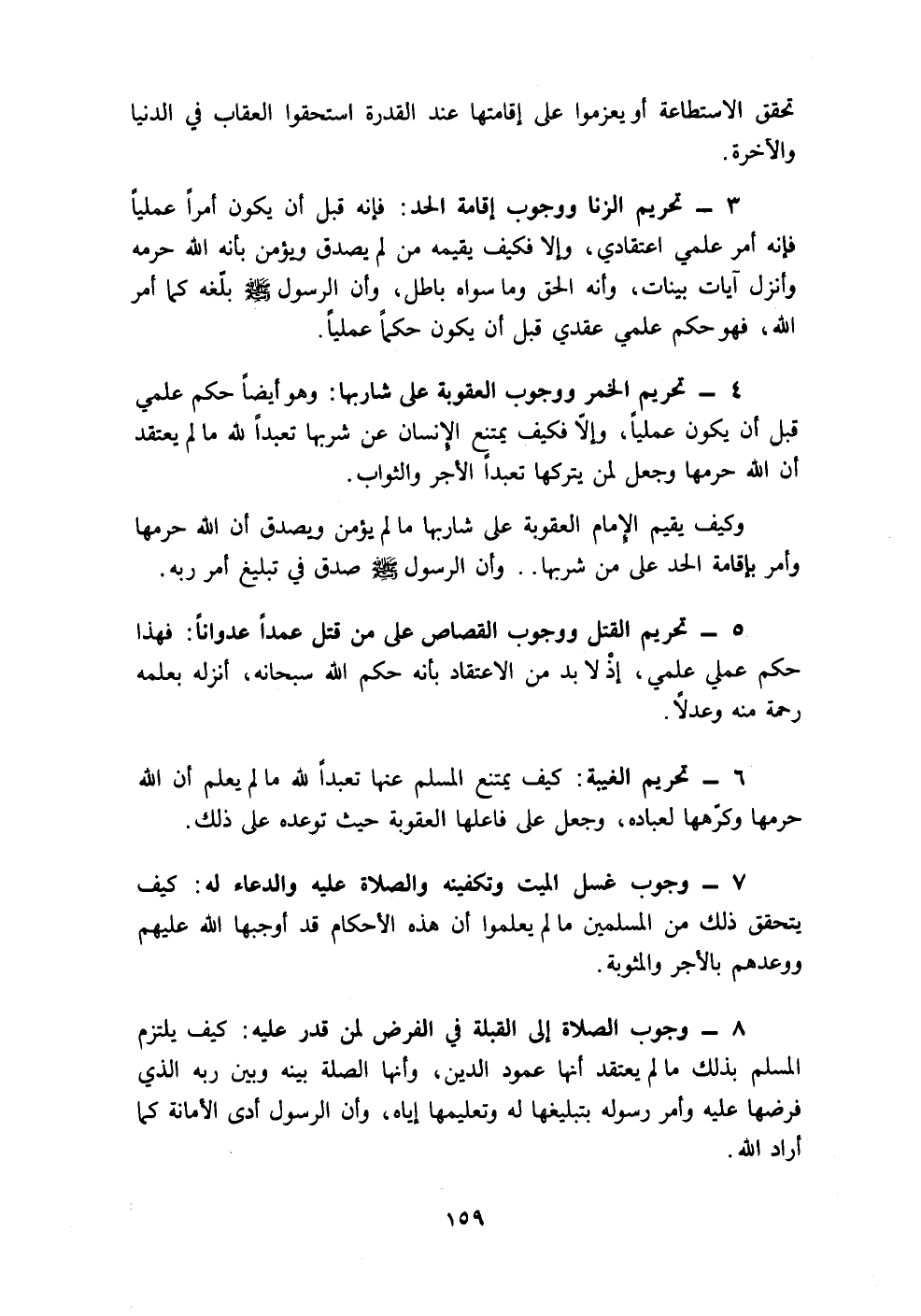 ٨ - وجوب الصلاة إلى القبلة في الفرض لمن قدر عليه: كيف يلتزم المسلم بذلك ما لم يعتقد أنها عمود الدين، وأنها الصلة بينه وبين ربه الذي فرضها عليه وأمر رسوله بتبليغها له وتعليمها إياه، وأن الرسول أدى الأمانة كما أراد الله.