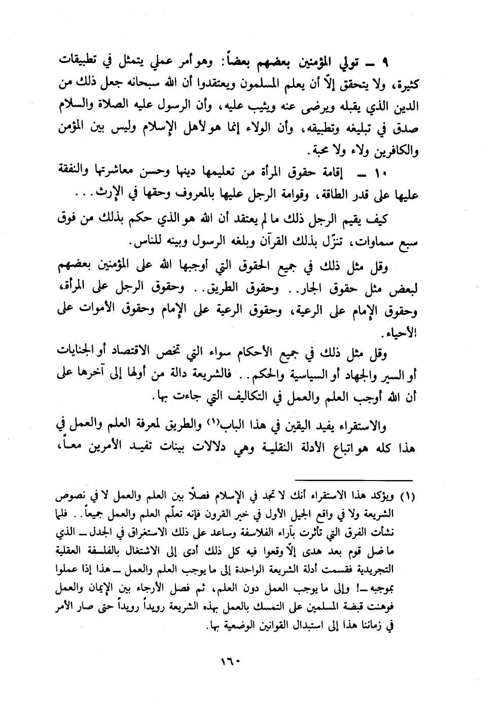 (١) ويؤكد هذا الاستقراء أنك لا تجد في الإِسلام فصلًا بين العلم والعمل لا في نصوص الشريعة ولا في واقع الجيل الأول في خيى القرون فإنه تعلَّم العلم والعمل جميعًا .. فلما نشأت الفرق التي تأثرت بآراء الفلاسفة وساعد على ذلك الاستغراق في الجدل - الذي ما ضل قوم بعد هدى إلّا وقعوا فيه كل ذلك أدى إلى الاشتغال بالفلسفة العقلية التجريدية فقسمت أدلة الشريعة الواحدة إلى ما يوجب العلم والعمل - هذا إذا عملوا بموجبه -! وإلى ما يوجب العمل دون العلم، ثم فصل الأرجاء بين الإِيمان والعمل فوهنت قبضة المسلمين على التمسك بالعمل بهذه الشريعة رويدًا رويدًا حتى صار الأمر في زماننا هذا إلى استبدال القوانين الوضعية بها.