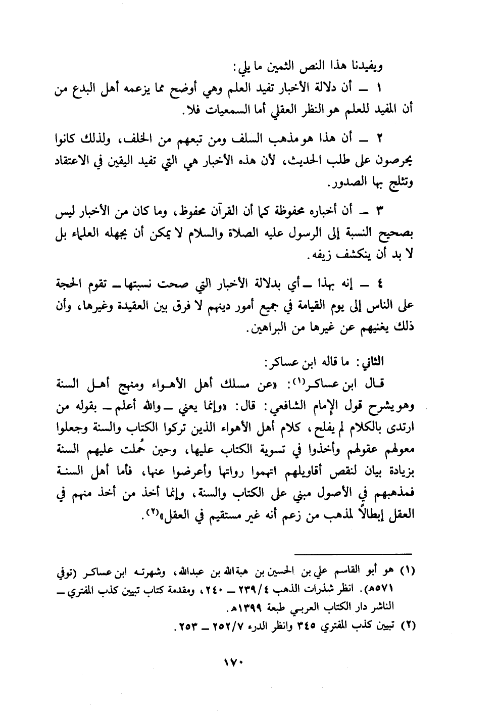 ٢ - أن هذا هو مذهب السلف ومن تبعهم من الخلف، ولذلك كانوا يحرصون على طلب الحديث، لأن هذه الأخبار هي التي تفيد اليقين في الاعتقاد وتثلج بها الصدور.