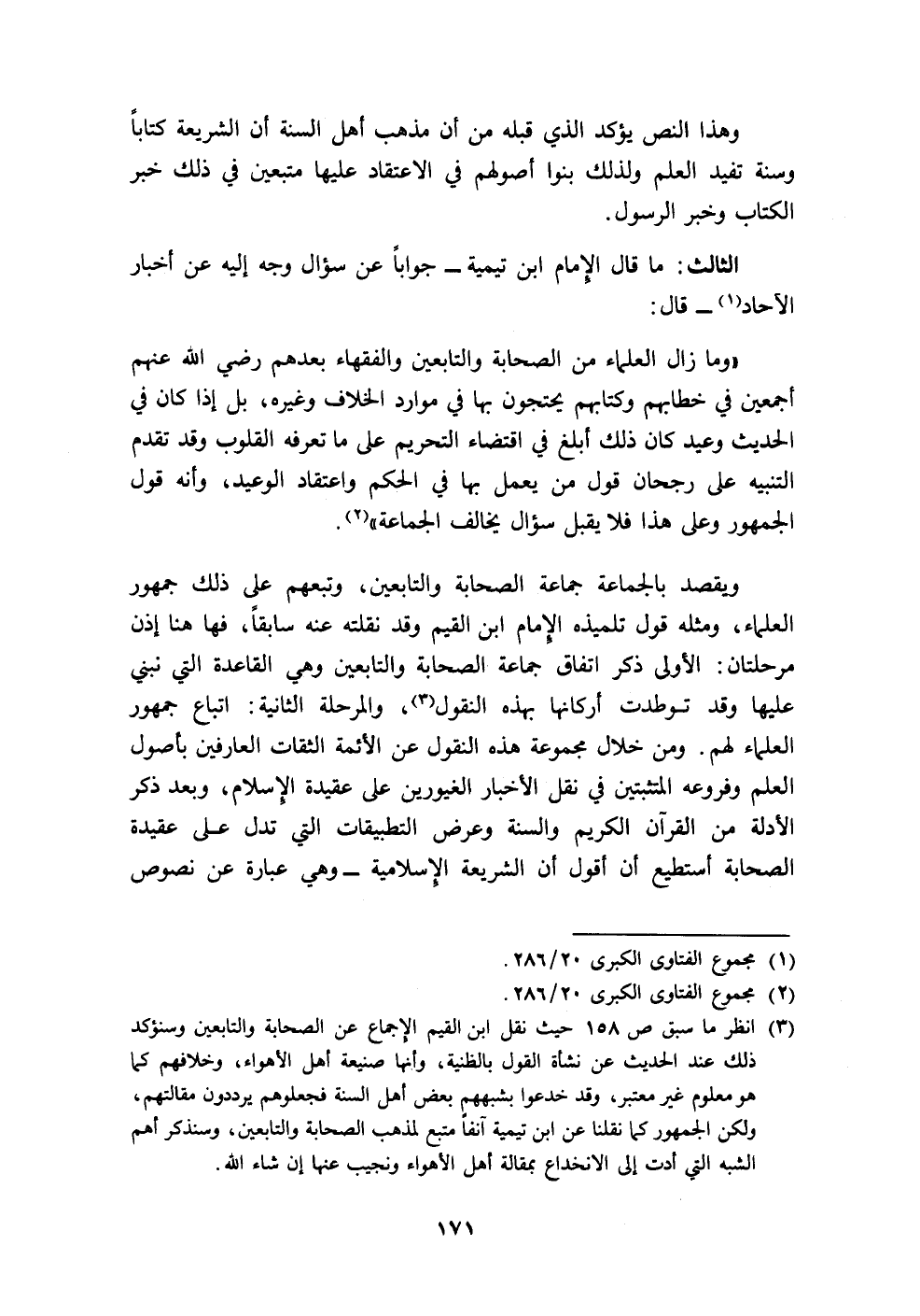 ويقصد بالجماعة جماعة الصحابة والتابعين، وتبعهم على ذلك جمهور العلماء، ومثله قول تلميذه الإِمام ابن القيم وقد نقلته عنه سابقًا، فها هنا إذن مرحلتان: الأولى ذكر اتفاق جماعة الصحابة والتابعين وهي القاعدة التي نبني عليها وقد توطدت أركانها بهذه النقول (٣)، والمرحلة الثانية: اتباع جمهور العلماء لهم. ومن خلال مجموعة هذه النقول عن الأئمة الثقات العارفين بأصول العلم وفروعه المتثبتين في نقل الأخبار الغيورين على عقيدة الإِسلام، وبعد ذكر الأدلة من القرآن الكريم والسنة وعرض التطبيقات التي تدل على عقيدة الصحابة أستطيع أن أقول أن الشريعة الإِسلامية - وهي عبارة عن نصوص