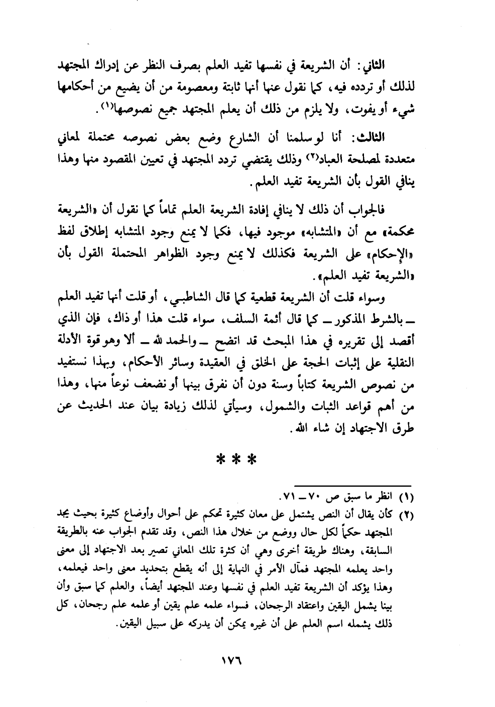 (٢) كان يقال أن النص يشتمل على معان كثيرة تحكم على أحوال وأوضاع كثيرة بحيث يجد المجتهد حكمًا لكل حال ووضع من خلال هذا النص، وقد تقدم الجواب عنه بالطريقة السابقة، وهناك طريقة أخرى وهي أن كثرة تلك المعاني تصير بعد الاجتهاد إلى معنى واحد يعلمه المجتهد فمآل الأمر في النهاية إلى أنه يقطع بتحديد معنى واحد فيعلمه، وهذا يؤكد أن الشريعة تفيد العلم في نفسها وعند المجتهد أيضًا، والعلم كما سبق وأن بينا يشمل اليقين واعتقاد الرجحان، فسواء علمه علم يقين أو علمه علم رجحان، كل ذلك يشمله اسم العلم على أن غيره يمكن أن يدركه على سبيل اليقين.