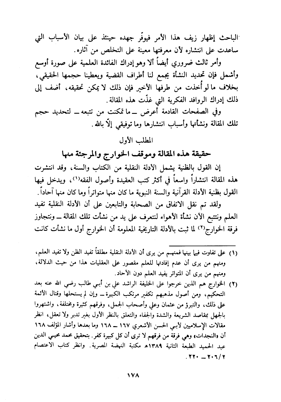 (٢) الخوارج هم الذين خرجوا على الخليفة الراشد علي بن أبي طالب - رضي الله عنه - بعد التحكيم، ومن أصول مذهبهم تكفير مرتكب الكبيرة - وإن لم يستحلها وقتال الأئمة على ذلك، والتبرؤ من عثمان وعلي وأصحاب الجمل، وفرقهم كثيرة ومختلفة، واشتهروا بالجهل بمقاصد الشريعة والشدة والجفاء والتعلق بالنظر الأول بغير تدبر ولا تعقل، انظر مقالات الإِسلاميين لأبي الحسن الأشعري ١٦٧ - ١٦٨ وما بعدها وأشار المؤلف ١٦٨ أن "النجدات" وهي فرقة من فرقهم لا ترى أن كل كبيرة كفر. بتحقيق محمد محيي الدين عبد الحميد الطبعة الثانية ١٣٨٩ هـ مكتبة النهضة المصرية. وانظر كتاب الاعتصام ٢/ ٢٠٦ - ٢٢٠.