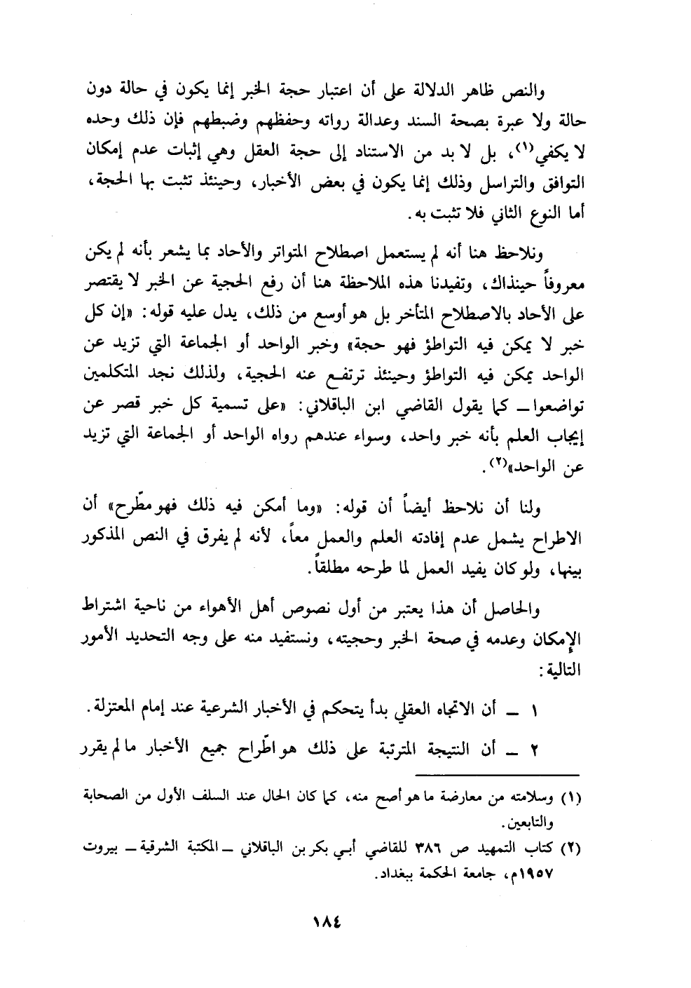 (٢) كتاب التمهيد ص ٣٨٦ للقاضي أبي بكر بن الباقلاني - المكتبة الشرقية - بيروت ١٩٥٧ م، جامعة الحكمة ببغداد.