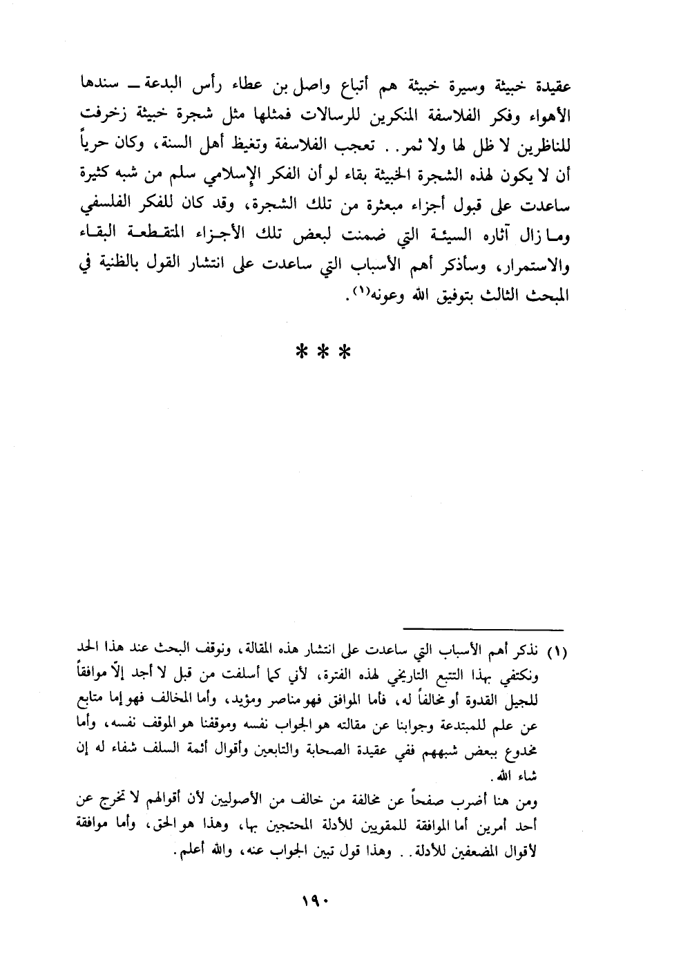 عقيدة خبيثة وسيرة خبيثة هم أتباع واصل بن عطاء رأس البدعة - سندها الأهواء وفكر الفلاسفة المنكرين للرسالات فمثلها مثل شجرة خبيثة زخرفت للناظرين لا ظل لها ولا ثمر .. تعجب الفلاسفة وتغيظ أهل السنة، وكان حريًا أن لا يكون لهذه الشجرة الخبيثة بقاء لوأن الفكر الإِسلامي سلم من شبه كثيرة ساعدت على قبول أجزاء مبعثرة من تلك الشجرة، وقد كان للفكر الفلسفي وما زال آثاره السيئة التي ضمنت لبعض تلك الأجزاء المتقطعة البقاء والاستمرار، وسأذكر أهم الأسباب التي ساعدت على انتشار القول بالظنية في المبحث الثالث بتوفيق الله وعونه (١).