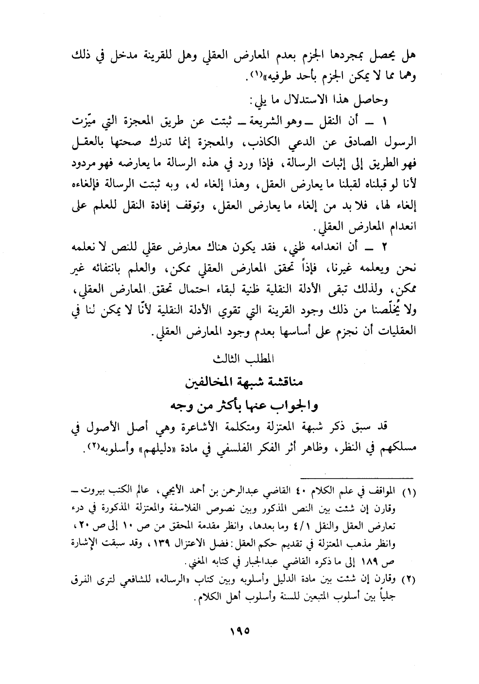 (١) المواقف في علم الكلام ٤٠ القاضي عبد الرحمن بن أحمد الأيجي، عالم الكتب بيروت - وقارن إن شئت بين النص المذكور وبين نصوص الفلاسفة والمعتزلة المذكورة في درء تعارض العقل والنقل ١/ ٤ وما بعدها، وانظر مقدمة المحقق من ص ١٠ إلى ص ٢٠، وانظر مذهب المعتزلة في تقديم حكم العقل: فضل الاعتزال ١٣٩، وقد سبقت الإِشارة ص ١٨٩ إلى ما ذكره القاضي عبد الجبار في كتابه المغني.