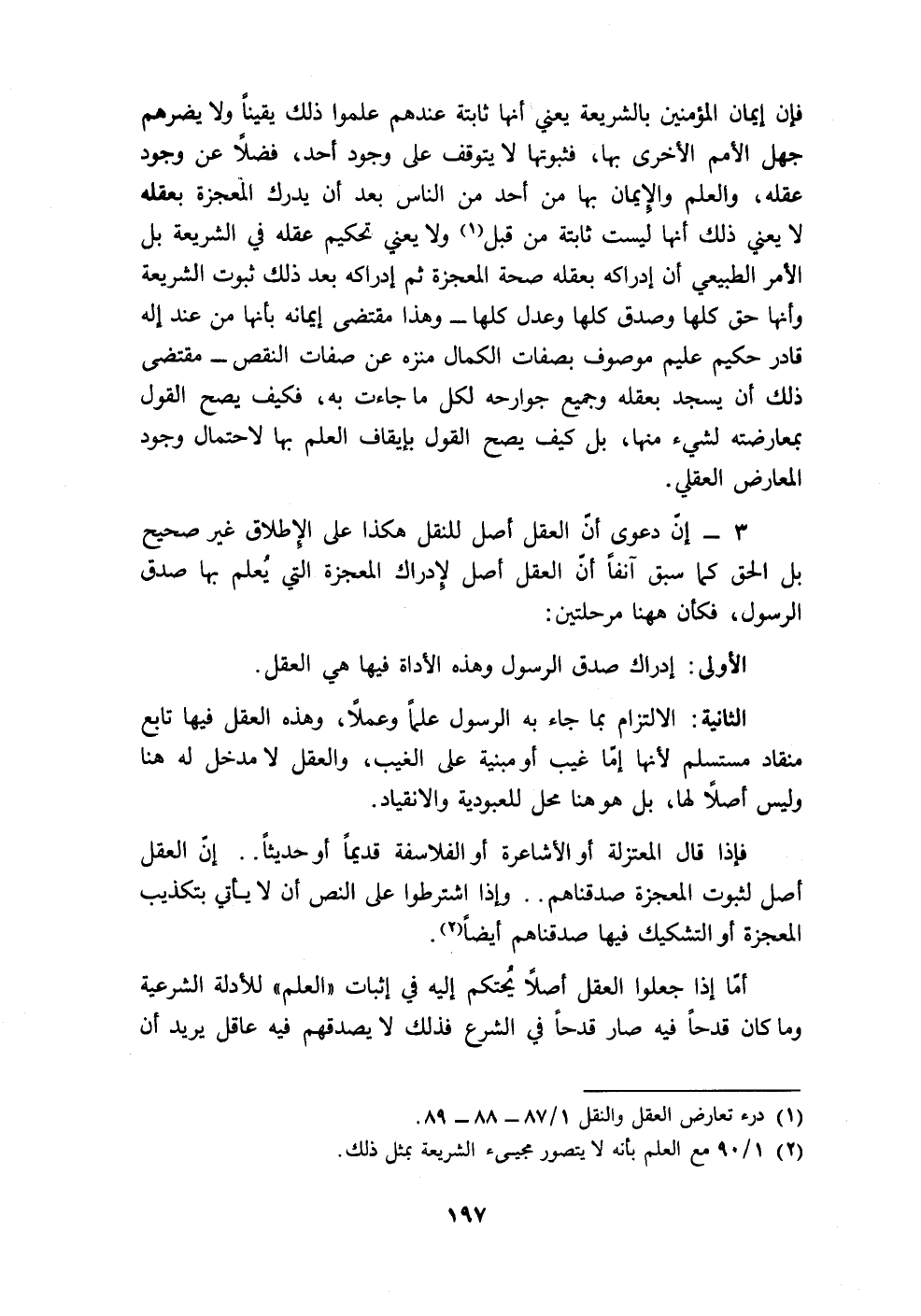 ٣ - إنّ دعوى أنّ العقل أصل للنقل هكذا على الإطلاق غير صحيح بل الحق كما سبق آنفًا أن العقل أصل لإِدراك المعجزة التي يُعلم بها صدق الرسول، فكأن ههنا مرحلتين: