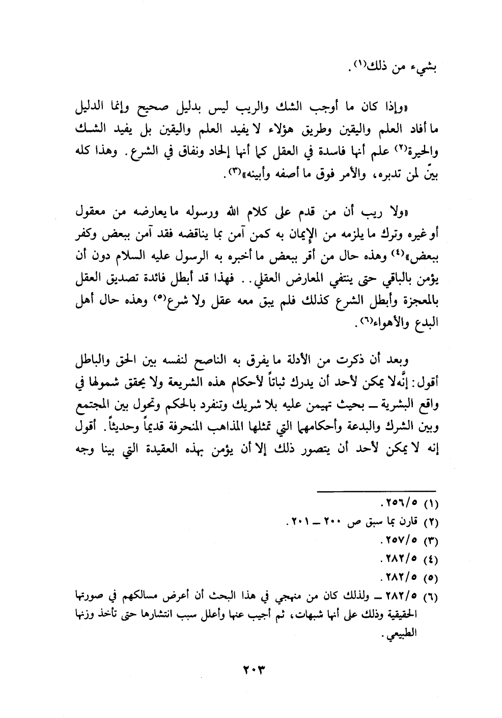 (٦) ٥/ ٢٨٢ - ولذلك كان من منهجي في هذا البحث أن أعرض مسالكهم في صورتها الحقيقية وذلك على أنها شبهات، ثم أجيب عنها وأعلل سبب انتشارها حتى تأخذ وزنها الطبيعي.