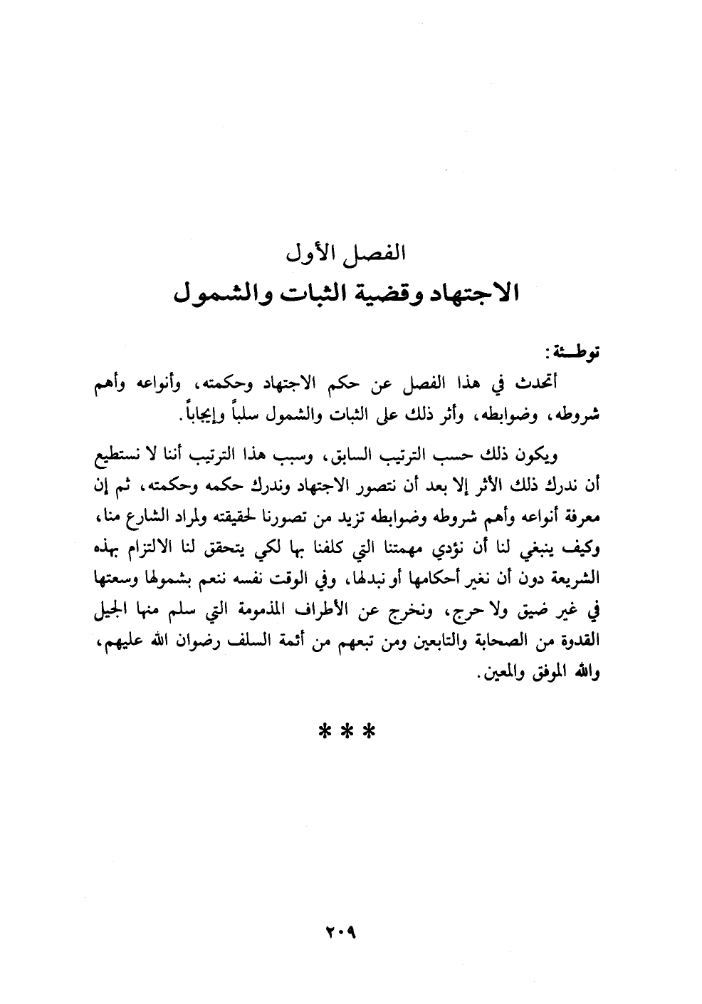 أتحدث في هذا الفصل عن حكم الاجتهاد وحكمته، وأنواعه وأهم شروطه، وضوابطه، وأثر ذلك على الثبات والشمول سلباً وإيجاباً.