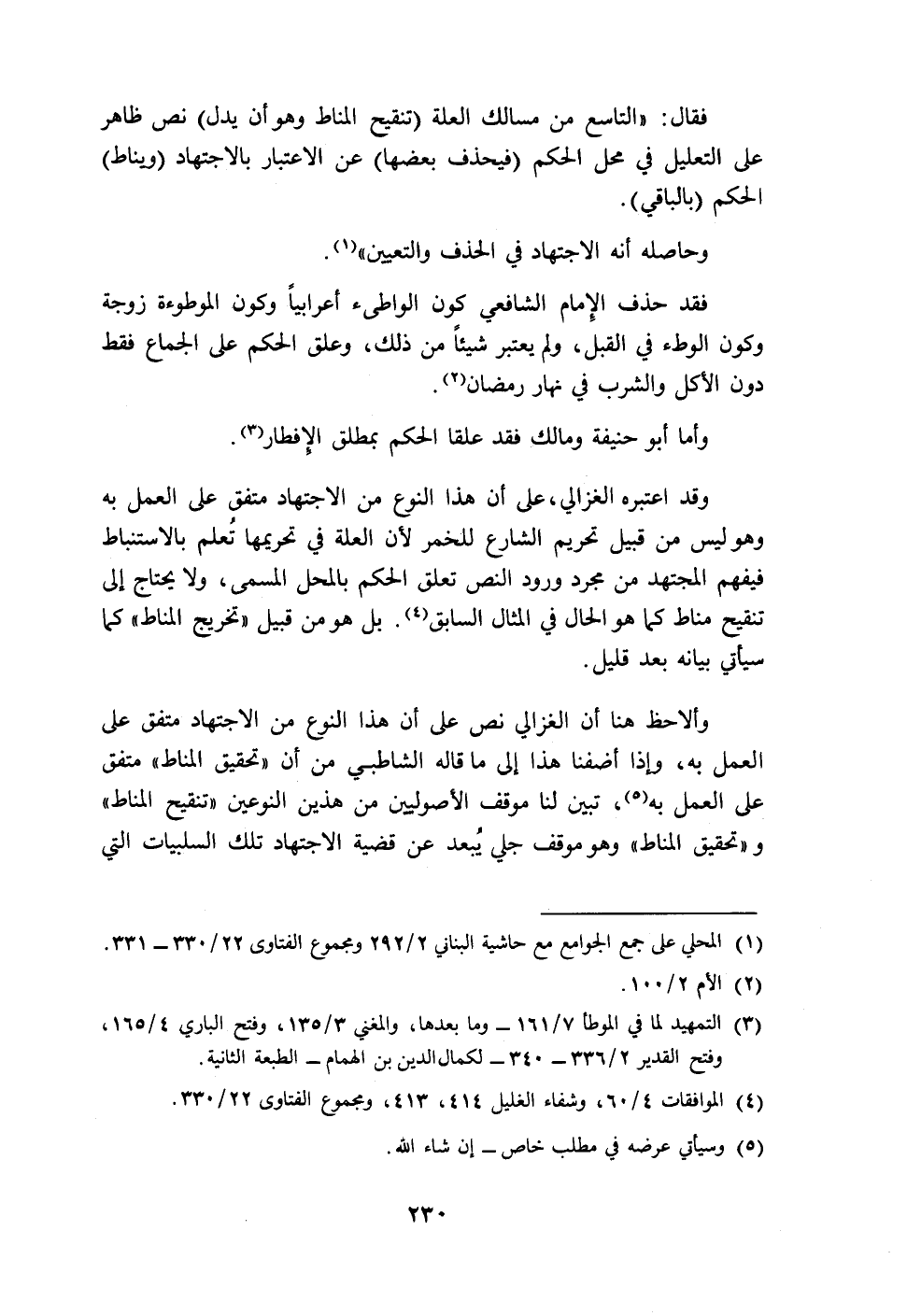 وألاحظ هنا أن الغزالي نص على أن هذا النوع من الاجتهاد متفق على العمل به، وإذا أضفنا هذا إلى ما قاله الشاطبي من أن "تحقيق المناط" متفق على العمل به (٥)، تبين لنا موقف الأصوليين من هذين النوعين "تنقيح المناط" و"تحقيق المناط" وهو موقف جلي يُبعد عن قضية الاجتهاد تلك السلبيات التي