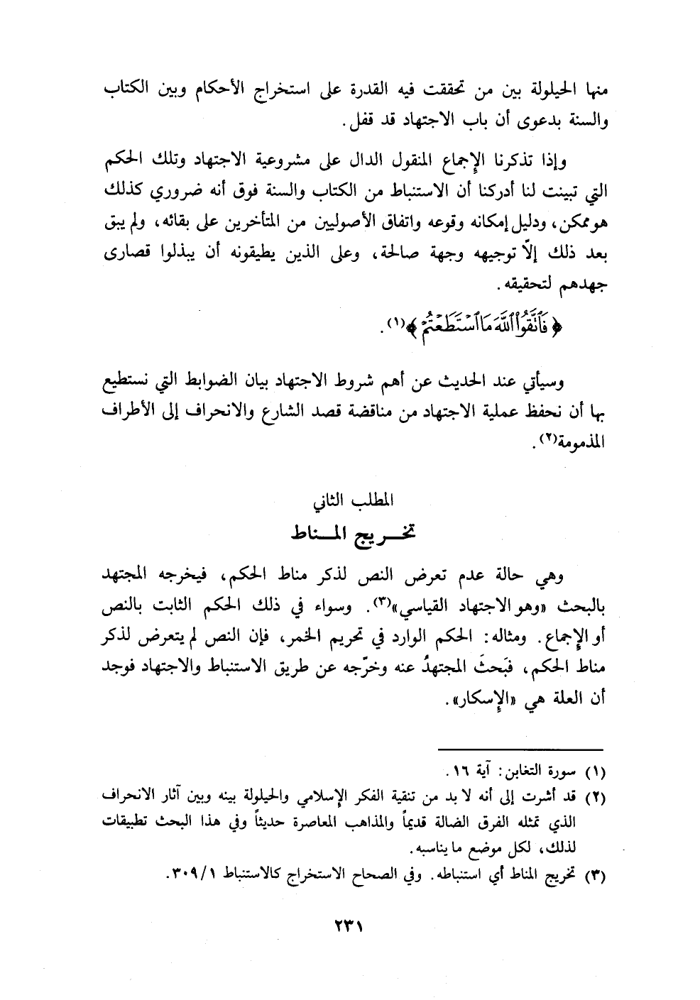 وإذا تذكرنا الإِجماع المنقول الدال على مشروعية الاجتهاد وتلك الحكم التي تبينت لنا أدركنا أن الاستنباط من الكتاب والسنة فوق أنه ضروري كذلك هو ممكن، ودليل إمكانه وقوعه واتفاق الأصوليين من المتأخرين على بقائه، ولم يبق بعد ذلك الأتوجيهه وجهة صالحة، وعلى الذين يطيقونه أن يبذلوا قصارى جهدهم لتحقيقه.