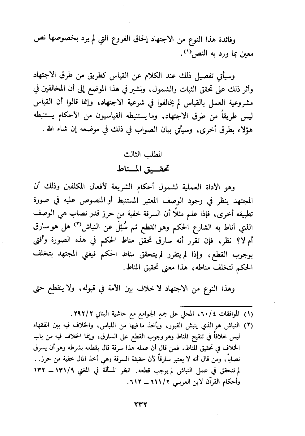 وهو الأداة العملية لشمول أحكام الشريعة لأفعال المكلفين وذلك أن المجتهد ينظر في وجود الوصف المعتبر المستنبط أو المنصوص عليه في سورة تطبيقه أخرى، فإذا علم مثلًا أن السرقة خفية من حرز قدر نصاب هي الوصف الذي أناط به الشارع الحكم وهو القطع ثم سُئِلَ عن النباش (٢) هل هو سارق أم لا؟ نظر، فإن تقرر أنه سارق تحقق مناط الحكم في هذه الصورة وأفتى بوجوب القطع، وإذا لم يتقرر لم يتحقق مناط الحكم فيفتي المجتهد بتخلف الحكم لتخلف مناطه، هذا معنى تحقيق المناط.