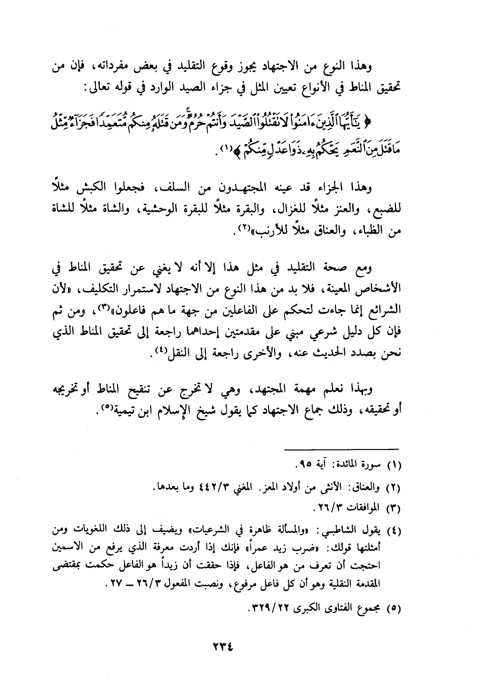 وهذا النوع من الاجتهاد يجوز وقوع التقليد في بعض مفرداته، فإن من تحقيق المناط في الأنواع تعيين المثل في جزاء الصيد الوارد في قوله تعالى: