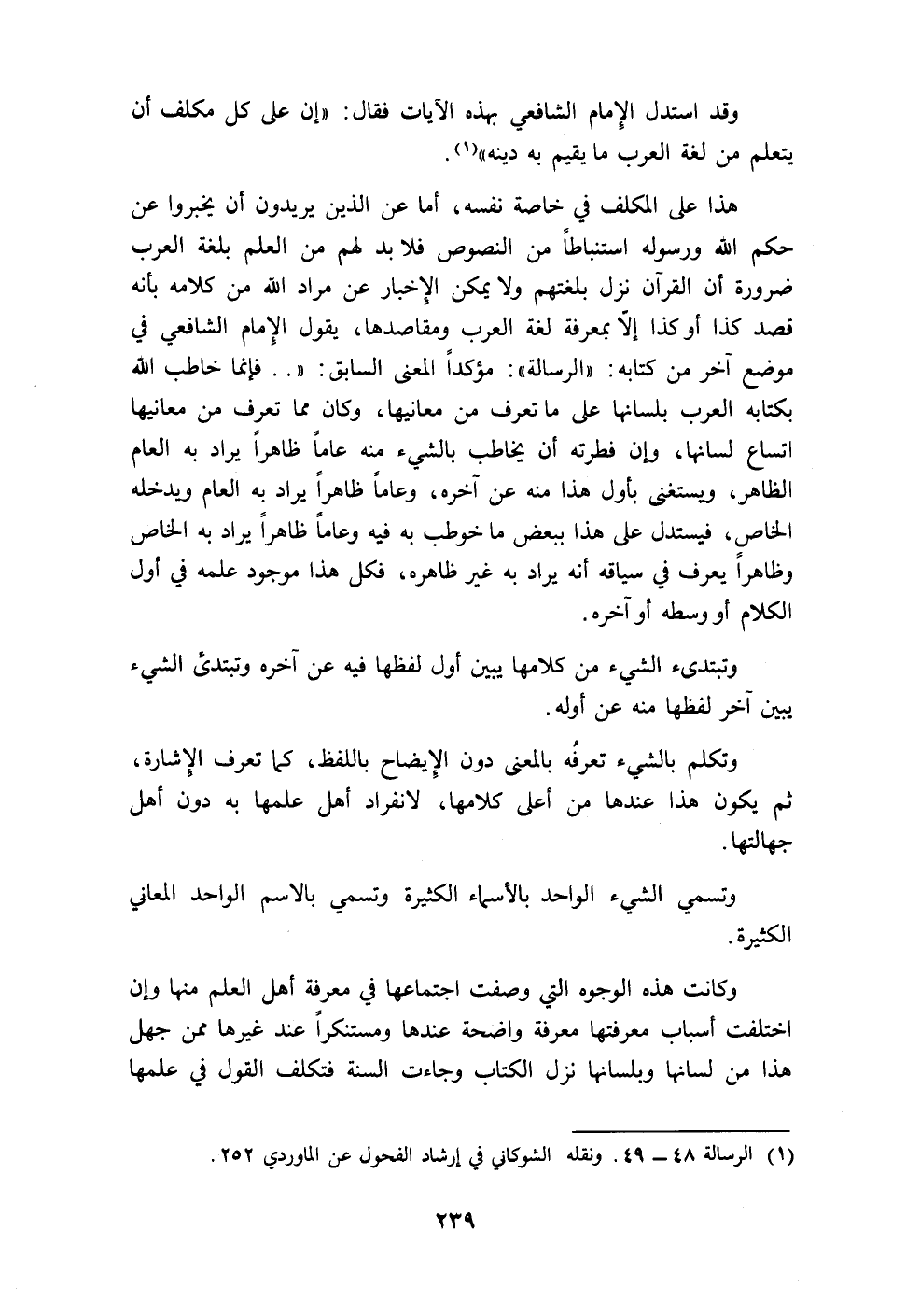 هذا على المكلف في خاصة نفسه، أما عن الذين يريدون أن يخبروا عن حكم الله ورسوله استنباطًا من النصوص فلابد لهم من العلم بلغة العرب ضرورة أن القرآن نزل بلغتهم ولا يمكن الإخبار عن مراد الله من كلامه بأنه قصد كذا أو كذا إلّا بمعرفة لغة العرب ومقاصدها، يقول الإِمام الشافعي في موضع آخر من كتابه: "الرسالة": مؤكدًا المعنى السابق: " .. فإنما خاطب الله بكتابه العرب بلسانها على ما تعرف من معانيها، وكان مما تعرف من معانيها اتساع لسانها، وإن فطرته أن يخاطب بالشيء منه عامًا ظاهرًا يراد به العام الظاهر، ويستغنى بأول هذا منه عن آخره، وعامًا ظاهرًا يراد به العام ويدخله الخاصِ، فيستدل على هذا ببعض ما خوطب به فيه وعامًا ظاهرًا يراد به الخاص وظاهرًا يعرف في سياقه أنه يراد به غير ظاهره، فكل هذا موجود علمه في أول الكلام أو وسطه أو آخره.