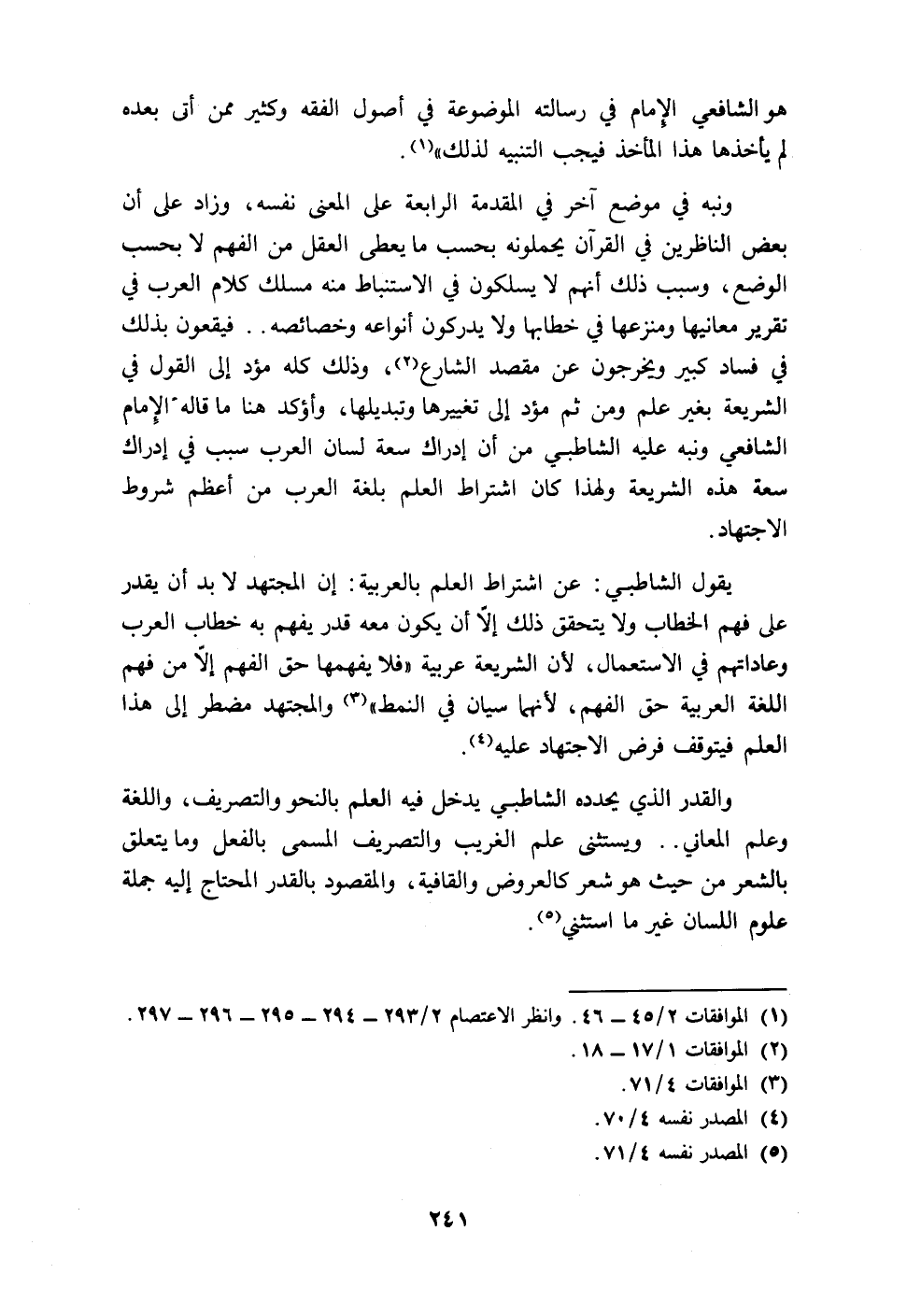 يقول الشاطبي: عن اشتراط العلم بالعربية: إن المجتهد لابد أن يقدر على فهم الخطاب ولا يتحقق ذلك إلّا أن يكون معه قدر يفهم به خطاب العرب وعاداتهم في الاستعمال، لأن الشريعة عربية "فلا يفهمها حق الفهم إلّا من فهم اللغة العربية حق الفهم، لأنهما سيان في النمط" (٣) والمجتهد مضطر إلى هذا العلم فيتوقف فرض الاجتهاد عليه (٤).