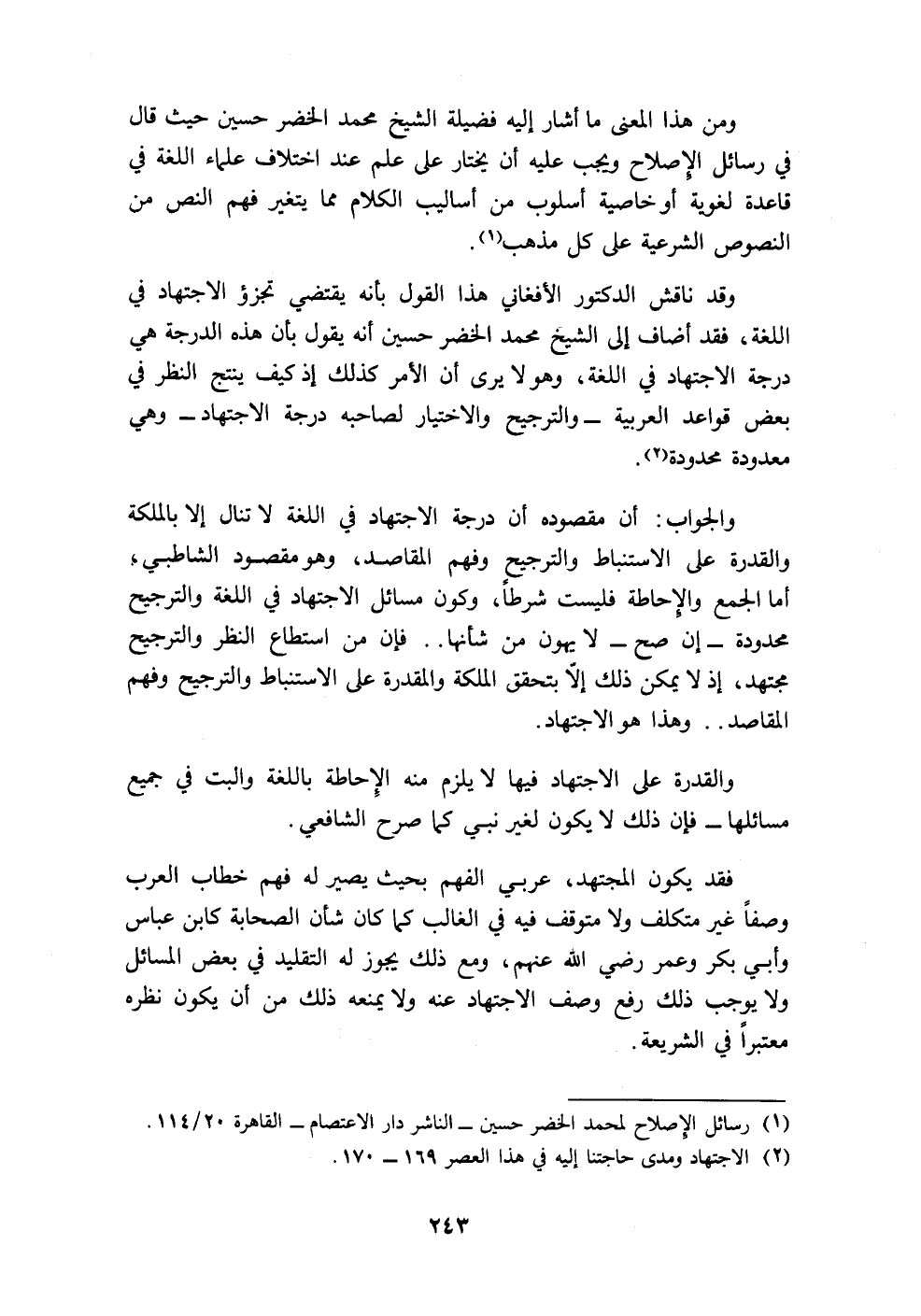 وقد ناقش الدكتور الأفغاني هذا القول بأنه يقتضي تجزؤ الاجتهاد في اللغة، فقد أضاف إلى الشيخ محمد الخضر حسين أنه يقول بأن هذه الدرجة هي درجة الاجتهاد في اللغة، وهو لا يرى أن الأمر كذلك إذ كيف ينتج النظر في بعض قواعد العربية -والترجيح والاختيار لصاحبه درجة الاجتهاد- وهي معدودة محدودة (٢).