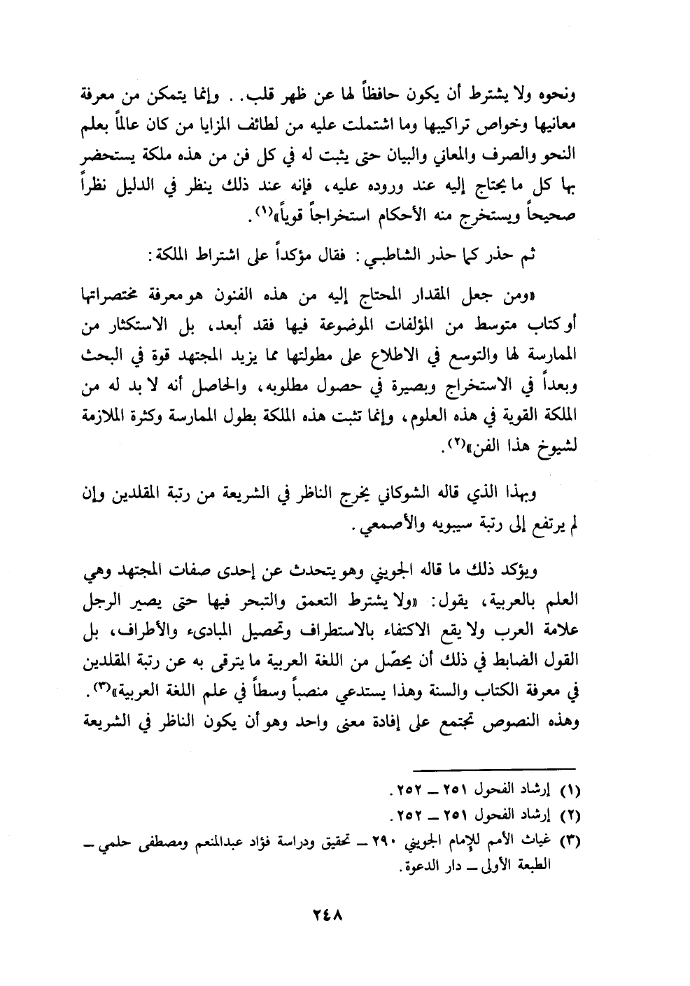 "ومن جعل المقدار المحتاج إليه من هذه الفنون هو معرفة مختصراتها أو كتاب متوسط من المؤلفات الموضوعة فيها فقد أبعد، بل الاستكثار من الممارسة لها والتوسع في الاطلاع على مطولتها مما يزيد المجتهد قوة في البحث وبعدًا في الاستخراج وبصيرة في حصول مطلوبه، والحاصل أنه لا بد له من الملكة القوية في هذه العلوم، وإنما تثبت هذه الملكة بطول الممارسة وكثرة الملازمة لشيوخ هذا الفن" (٢).