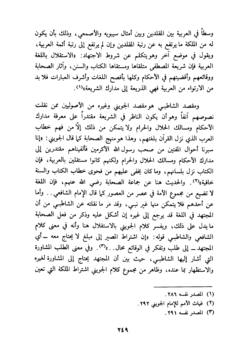 ومقصد الشاطبي هو مقصد الجويني وغيره من الأصوليين ممن نقلت نصوصهم آنفًا وهو أن يكون الناظر في الشريعة مقتدرًا على معرفة مدارك الأحكام ومسالك الحلال والحرام ولا يتمكن من ذلك إلّا من فهم خطاب العرب الذي نزل القرآن بلغتهم، وهذا هو منهج الصحابة كما قال الجويني: "إنا سبرنا أحوال المفتين من صحب رسول الله الأكرمين فالفيناهم مقتدرين إلى مدارك الأحكام ومسالك الحلال والحرام ولكنهم كانوا مستقلين بالعربية، فإن الكتاب نزل بلسانهم، وما كان يخفى عليهم من فحوى خطاب الكتاب والسنة خافية" (٢). والحديث هنا عن جماعة الصحابة - رضي الله عنهم -، فإن اللغة لا تضيع من مجموع الأمة في عصر من العصور كما قال الإِمام الشافعي .. وأما عن أحدهم فلا يتمكن منها غير نبي، وقد مر ما نقلته عن الشاطبي من أن المجتهد في اللغة قد يرجع إلى غيره إن أشكل عليه وذكر من فعل الصحابة ما يدل على ذلك، ويفسر كلام الجويني بالاستقلال هنا وأنه في معنى كلام الشافعي والشاطبي قوله: "إن اشتراط المصير إلى مبلغ لا يحتاج معه -أي المجتهد- إلى طلب وتفكر في الوقائع محال .. " (٣). وفي معنى الطلب المشاورة التي أشار إليها الشاطبي، حيث بين أن المجتهد يحتاج إلى المشاورة لغيره والاستظهار بما عنده، وظاهر من مجموع كلام الجويني اشتراط الملكة التي تعين