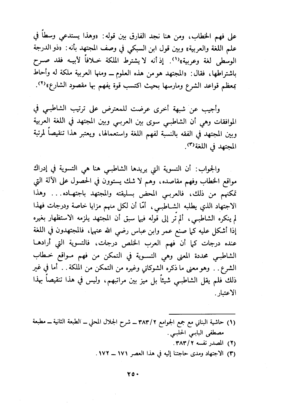والجواب: أن التسوية التي يريدها الشاطبي هنا هي التسوية في إدراك مواقع الخطاب وفهم مقاصده، وهم لا شك يستوون في الحصول على الآلة التي تمكنهم من ذلك، فالعربي المحض بسليقته والمجتهد باجتهاده ... وهذا الاجتهاد الذي يطلبه الشاطبي، أمّا أن لكل منهم مزايا خاصة ودرجات فهذا لم ينكره الشاطبي، ألم تر إلى قوله فيما سبق أن المجتهد يلزمه الاستظهار بغيره إذا أشكل عليه كما صنع عمر وابن عباس - رضي الله عنهما -، فالمجتهدون في اللغة عنده درجات كما أن فهم العرب الخلص درجات، فالتسوية التي أرادها الشاطبي محددة المعنى وهي التسوية في التمكن من فهم مواقع خطاب الشرع .. وهو معنى ما ذكره الشوكاني وغيره من التمكن من الملكة .. أما في غير ذلك فلم يقل الشاطبي شيئًا بل ميز بين مراتبهم، وليس في هذا تنقيصًا بهذا الاعتبار.