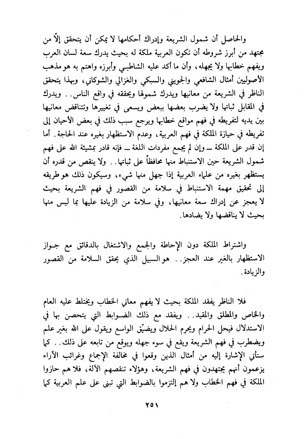 والحاصل أن شمول الشريعة وإدراك أحكامها لا يمكن أن يتحقق إلّا من مجتهد من أبرز شروطه أن تكون العربية ملكة له بحيث يدرك سعة لسان العرب ويفهم خطابها ولا يجهله، وأن ما أكد عليه الشاطبي وأبرزه واهتم به هو مذهب الأصوليين أمثال الشافعي والجويني والسبكي والغزالي والشوكاني، وبهذا يتحقق الناظر في الشريعة من معانيها ويدرك شمولها ويحققه في واقع الناس .. ويدرك في المقابل ثباتها ولايضرب بعضها ببعض ويسعى في تغييرها وتتناقض معانيها بين يديه لتفريطه في فهم مواقع خطابها ويرجع سبب ذلك في بعض الأحيان إلى تفريطه في حيازة الملكة في فهم العربية، وعدم الاستظهار بغيره عند الحاجة. أما إن قدر على الملكة -وإن لم يجمع مفردات اللغة- فإنه قادر بمشيئة الله على فهم شمول الشريعة حين الاستنباط منها محافظاً على ثباتها .. ولا ينقص من قدره أن يستظهر بغيره من علماء العربية إذا جهل منها شيء، وسيكون ذلك هو طريقه إلى تحقيق مهمة الاستنباط في سلامة من القصور في فهم الشريعة بحيث لا يعجز عن إدراك سعة معانيها، وفي سلامة من الزيادة عليها بما ليس منها بحيث لا يناقضها ولا يضادها.