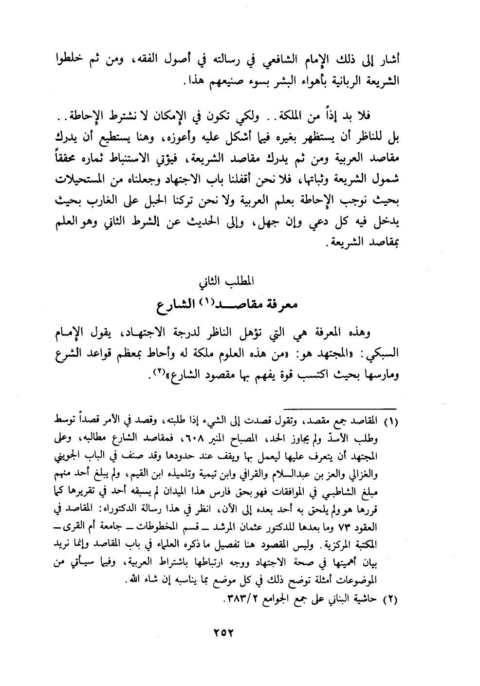 (١) المقاصد جمع مقصد، وتقول قصدت إلى الشيء إذا طلبته، وقصد في الأمر قصداً توسط وطلب الأسدّ ولم يجاوز الحد، المصباح المنير ٦٠٨، فمقاصد الشارع مطالبه، وعلى المجتهد أن يتعرف عليها ليعمل بها ويقف عند حدودها وقد صنف في الباب الجويني والغزالي والعز بن عبدالسلام والقرافي وابن تيمية وتلميذه ابن القيم، ولم يبلغ أحد منهم مبلغ الشاطبي في الموافقات فهو بحق فارس هذا الميدان لم يسبقه أحد في تقريرها كما قررها هو ولم يلحق به أحد بعده إلى الأن، انظر في هذا رسالة الدكتوراه: المقاصد في العقود ٧٣ وما بعدها للدكتور عثمان المرشد -قسم المخطوطات- جامعة أم القرى - المكتبة المركزية. وليس المقصود هنا تفصيل ما ذكره العلماء في باب المقاصد وإنما نريد بيان أهميتها في صحة الاجتهاد ووجه ارتباطها باشتراط العربية، وفيما سيأتي من الموضوعات أمثلة توضح ذلك في كل موضع بما يناسبه إن شاء الله.