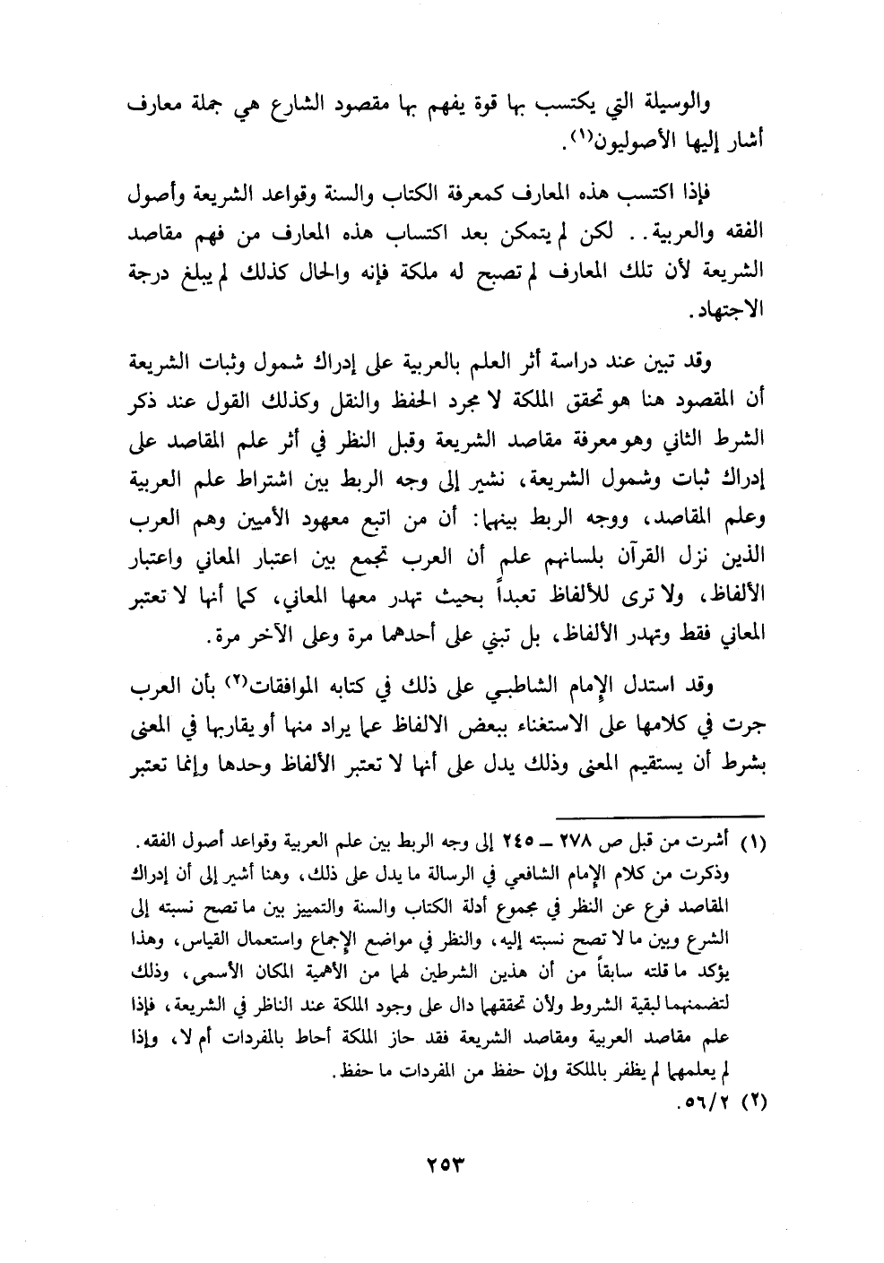 (١) أشرت من قبل ص ٢٧٨ - ٢٤٥ إلى وجه الربط بين علم العربية وقواعد أصول الفقه. وذكرت من كلام الإِمام الشافعي في الرسالة ما يدل على ذلك، وهنا أشير إلى أن إدراك المقاصد فرع عن النظر في مجموع أدلة الكتاب والسنة والتمييز بين ما تصح نسبته إلى الشرع وبين ما لا تصح نسبته إليه، والنظر في مواضع الإِجماع واستعمال القياس، وهذا يؤكد ما قلته سابقًا من أن هذين الشرطين لهما من الأهمية المكان الأسمى، وذلك لتضمنهما لبقية الشروط ولأن تحققهما دال على وجود الملكة عند الناظر في الشريعة، فإذا علم مقاصد العربية ومقاصد الشريعة فقد حاز الملكة أحاط بالمفردات أم لا، وإذا لم يعلمهما لم يظفر بالملكة وإن حفظ من المفردات ما حفظ.