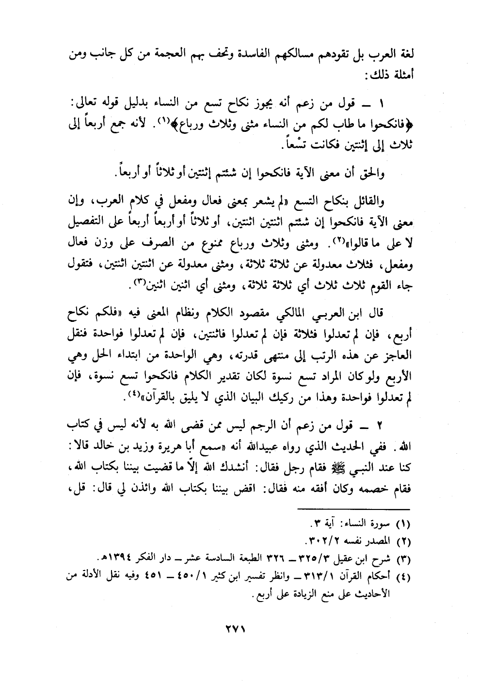 قال ابن العربي المالكي مقصود الكلام ونظام المعنى فيه "فلكم نكاح أربع، فإن لم تعدلوا فثلاثة فإن لم تعدلوا فاثنتين، فإن لم تعدلوا فواحدة فنقل العاجز عن هذه الرتب إلى منتهى قدرته، وهي الواحدة من ابتداء الحل وهي الأربع ولو كان المراد تسع نسوة لكان تقدير الكلام فانكحوا تسع نسوة، فإن لم تعدلوا فواحدة وهذا من ركيك البيان الذي لا يليق بالقرآن" (٤).