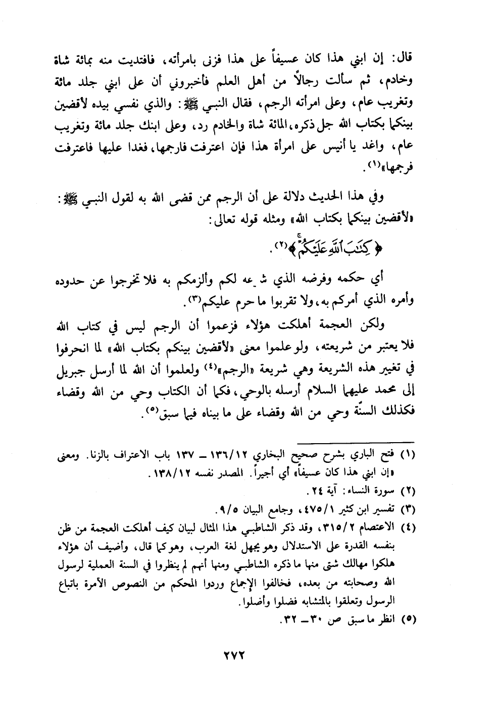(١) فتح الباري بشرح صحيح البخاري ١٢/ ١٣٦ - ١٣٧ باب الاعتراف بالزنا. ومعنى "إن ابني هذا كان عسيفاً" أي أجيراً. المصدر نفسه ١٢/ ١٣٨.