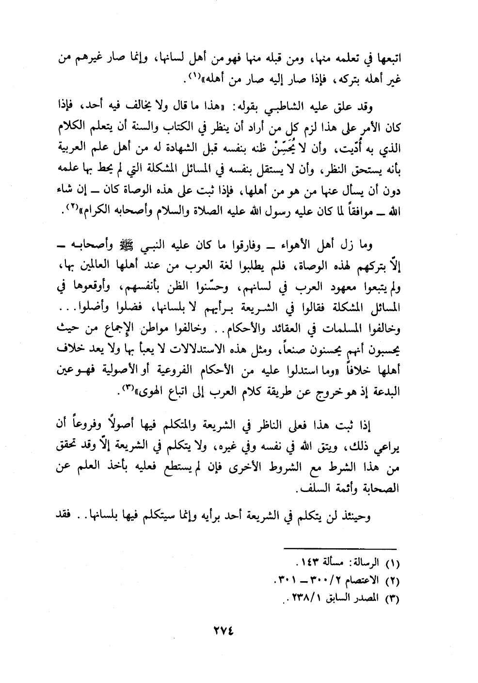 وقد علق عليه الشاطبي بقوله: "هذا ما قال ولا يخالف فيه أحد، فإذا كان الأمر على هذا لزم كل من أراد أن ينظر في الكتاب والسنة أن يتعلم الكلام الذي به أُدّيت، وأن لا يُحَسِّنْ ظنه بنفسه قبل الشهادة له من أهل علم العربية بأنه يستحق النظر، وأن لا يستقل بنفسه في المسائل المشكلة التي لم يحط بها علمه دون أن يسأل عنها من هو من أهلها، فإذا ثبت على هذه الوصاة كان - إن شاء الله - موافقاً لما كان عليه رسول الله - عليه الصلاة والسلام - وأصحابه الكرام" (٢).