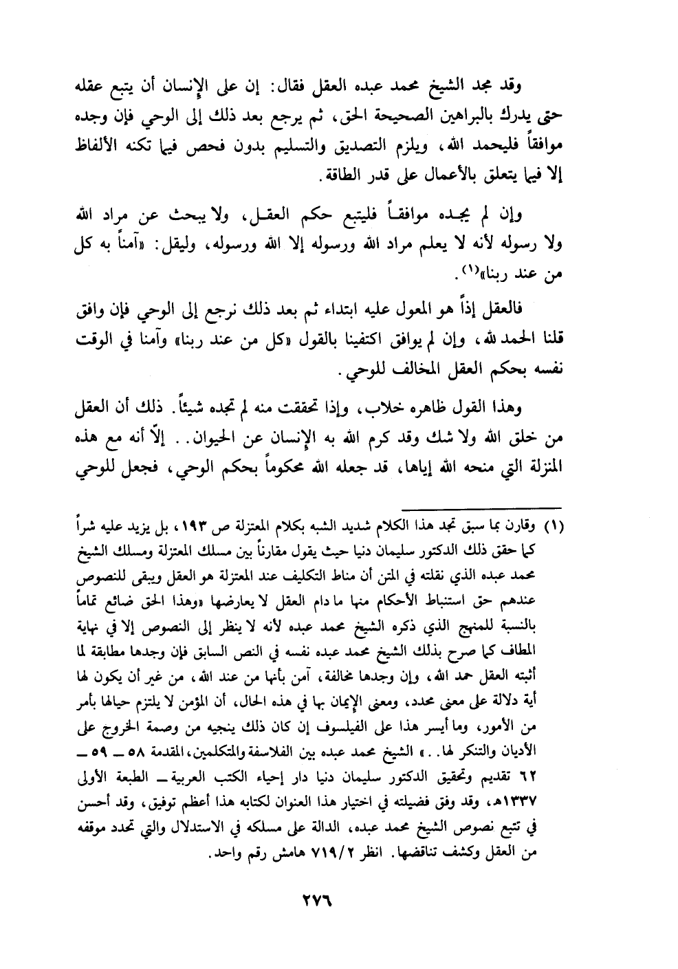 (١) وقارن بما سبق تجد هذا الكلام شديد الشبه بكلام المعتزلة ص ١٩٣، بل يزيد عليه شراً كما حقق ذلك الدكتور سليمان دنيا حيث يقول مقارناً بين مسلك المعتزلة ومسلك الشيخ محمد عبده الذي نقلته في المتن أن مناط التكليف عند المعتزلة هو العقل ويبقى للنصوص عندهم حق استنباط الأحكام منها ما دام العقل لا يعارضها "وهذا الحق ضائع تماماً بالنسبة للمنهج الذي ذكره الشيخ محمد عبده لأنه لا ينظر إلى النصوص إلا في نهاية المطاف كما صرح بذلك الشيخ محمد عبده نفسه في النص السابق فإن وجدها مطابقة لما أثبته العقل حمد الله، وإن وجدها غالفة، آمن بأنها من عند الله، من غير أن يكون لها أية دلالة على معنى محدد، ومعنى الإِيمان بها في هذه الحال، أن المؤمن لا يلتزم حيالها بأمر من الأمور، وما أيسر هذا على الفيلسوف إن كان ذلك ينجيه من وصمة الخروج على الأديان والتنكر لها .. " الشيخ محمد عبده بين الفلاسفة والمتكلمين، المقدمة ٥٨ - ٥٩ - ٦٢ تقديم وتحقيق الدكتور سليمان دنيا دار إحياء الكتب العربية - الطبعة الأولى ١٣٣٧ هـ، وقد وفق فضيلته في اختيار هذا العنوان لكتابه هذا أعظم توفيق، وقد أحسن في تتبع نصوص الشيخ محمد عبده، الدالة على مسلكه في الاستدلال والتي تحدد موقفه من العقل وكشف تناقضها. انظر ٢/ ٧١٩ هامش رقم واحد.