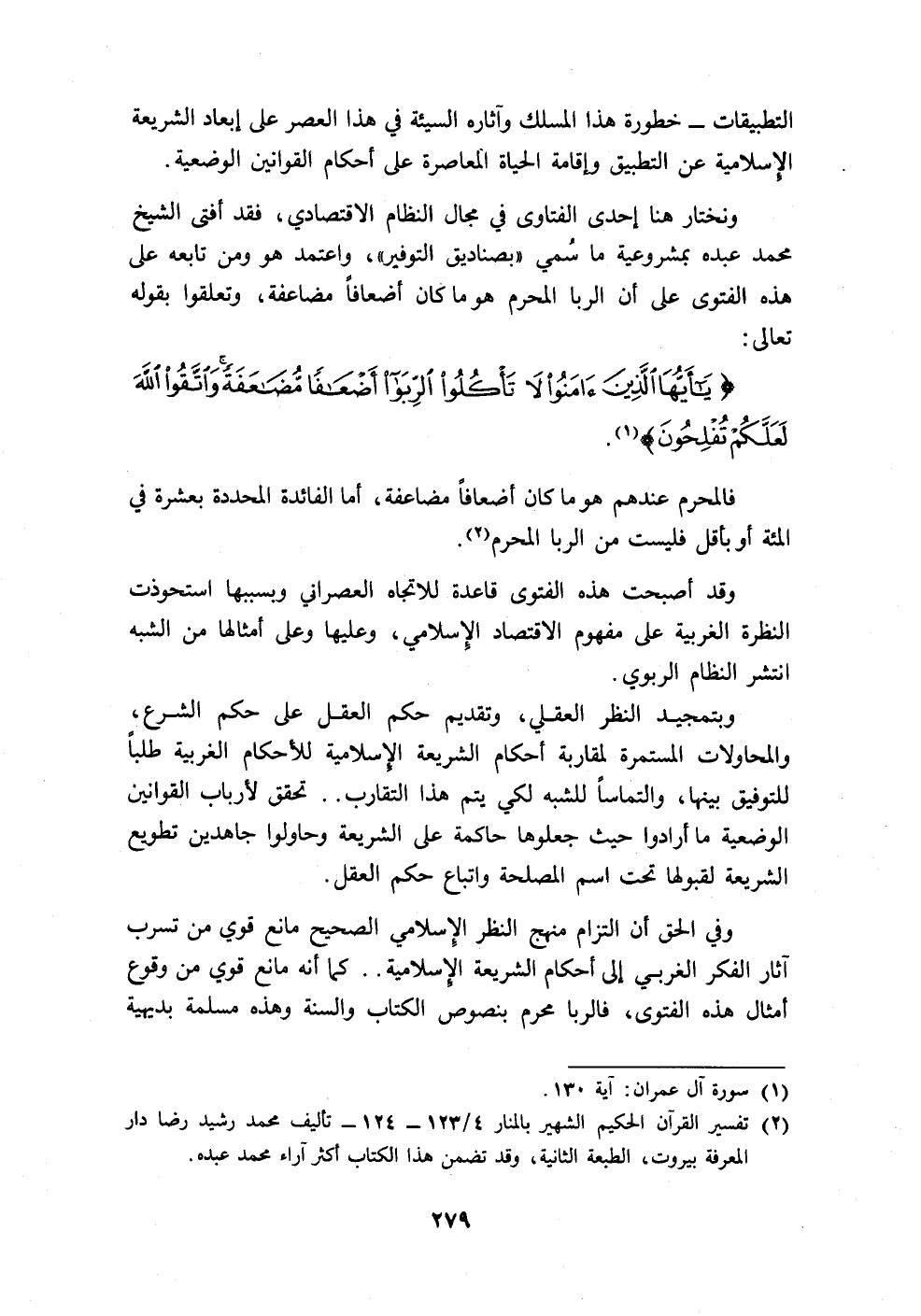 (٢) تفسير القرآن الحكيم الشهير بالمنار ٤/ ١٢٣ - ١٢٤ - تأليف محمد رشيد رضا دار المعرفة بيروت، الطبعة الثانية، وقد تضمن هذا الكتاب أكثر آراء محمد عبده.