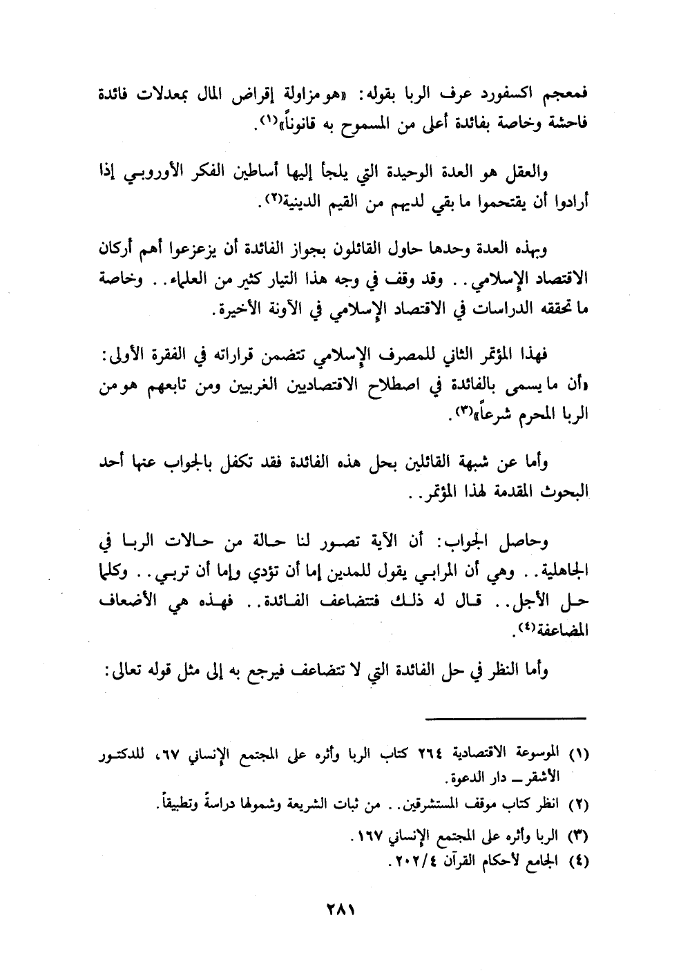 فهذا المؤتمر الثاني للمصرف الإِسلامي تتضمن قراراته في الفقرة الأولى: "أن ما يسمى بالفائدة في اصطلاح الاقتصاديين الغربيين ومن تابعهم هو من الربا المحرم شرعاً" (٣).