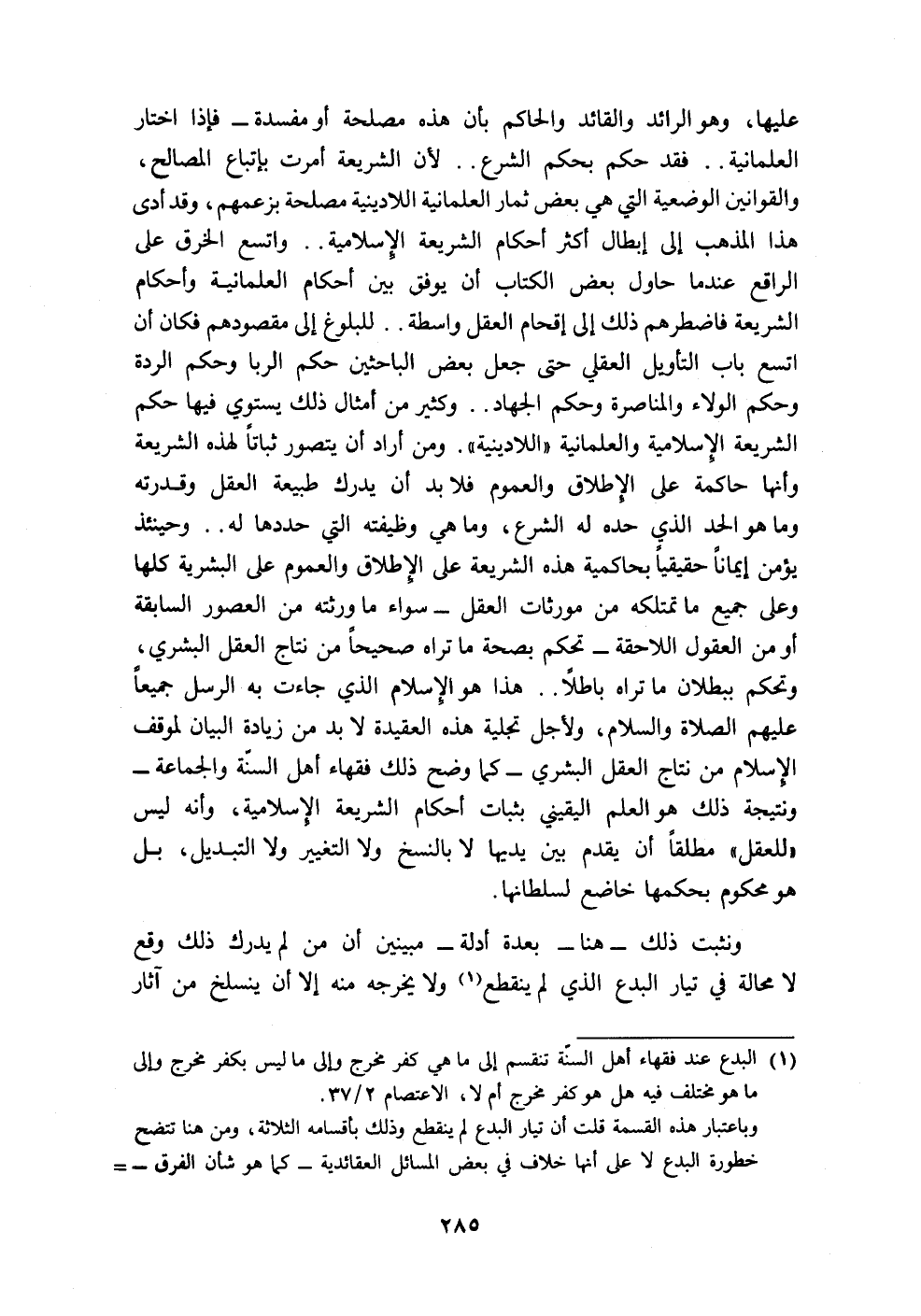 عليها، وهو الرائد والقائد والحاكم بأن هذه مصلحة أو مفسدة - فإذا اختار العلمانية .. فقد حكم بحكم الشرع .. لأن الشريعة أمرت بإتباع المصالح، والقوانين الوضعية التي هي بعض ثمار العلمانية اللادينية مصلحة بزعمهم، وقد أدى هذا المذهب إلى إبطال أكثر أحكام الشريعة الإِسلامية .. واتسع الخرق على الراقع عندما حاول بعض الكتاب أن يوفق بين أحكام العلمانية وأحكام الشريعة فاضطرهم ذلك إلى إقحام العقل واسطة .. للبلوغ إلى مقصودهم فكان أن اتسع باب التأويل العقلي حتى جعل بعض الباحثين حكم الربا وحكم الردة وحكم الولاء والمناصرة وحكم الجهاد .. وكثير من أمثال ذلك يستوي فيها حكم الشريعة الإِسلامية والعلمانية "اللادينية". ومن أراد أن يتصور ثباتاً لهذه الشريعة وأنها حاكمة على الإطلاق والعموم فلا بد أن يدرك طبيعة العقل وقدرته وما هو الحد الذي حده له الشرع، وما هي وظيفته التي حددها له .. وحينئذ يؤمن إيماناً حقيقياً بحاكمية هذه الشريعة على الإِطلاق والعموم على البشرية كلها وعلى جميع ما تمتلكه من مورثات العقل - سواء ما ورثته من العصور السابقة أو من العقول اللاحقة - تحكم بصحة ما تراه صحيحاً من نتاج العقل البشري، وتحكم ببطلان ما تراه باطلًا .. هذا هو الإِسلام الذي جاءت به الرسل جميعاً عليهم الصلاة والسلام، ولأجل تجلية هذه العقيدة لا بد من زيادة البيان لموقف الإِسلام من نتاج العقل البشري - كما وضح ذلك فقهاء أهل السنّة والجماعة - ونتيجة ذلك هو العلم اليقيني بثبات أحكام الشريعة الإِسلامية، وأنه ليس "للعقل" مطلقاً أن يقدم بين يديها لا بالنسخ ولا التغيير ولا التبديل، بل هو محكوم بحكمها خاضع لسلطانها.