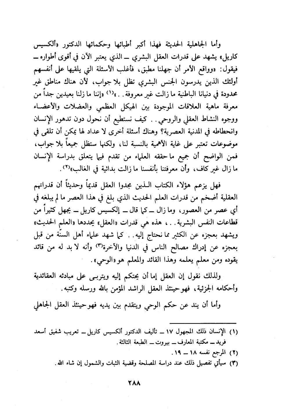 فهل يزعم هؤلاء الكتاب الذين مجدوا العقل قديماً وحديثاً أن قدراتهم العقلية أضخم من قدرات العلم الحديث الذي بلغ في هذا العصر ما لم يبلغه في أي عصر من العصور، وما زال -كما قال- إلكسيس كاريل - يجهل كثيراً من قطاعات النفس البشرية .. ، هذه هي قدرات "العقل" يحددها "العلم الحديث" ويشهد بعجزه عن الكثير مما نحتاج إليه .. كما شهد علماء أهل السنّة من قبل بعجزه عن إدراك مصالح الناس في الدنيا والآخرة (٣) وأنه لا بد له من قائد يقوده ومن معلم يعلمه وهذا القائد والمعلم هو "الوحي".