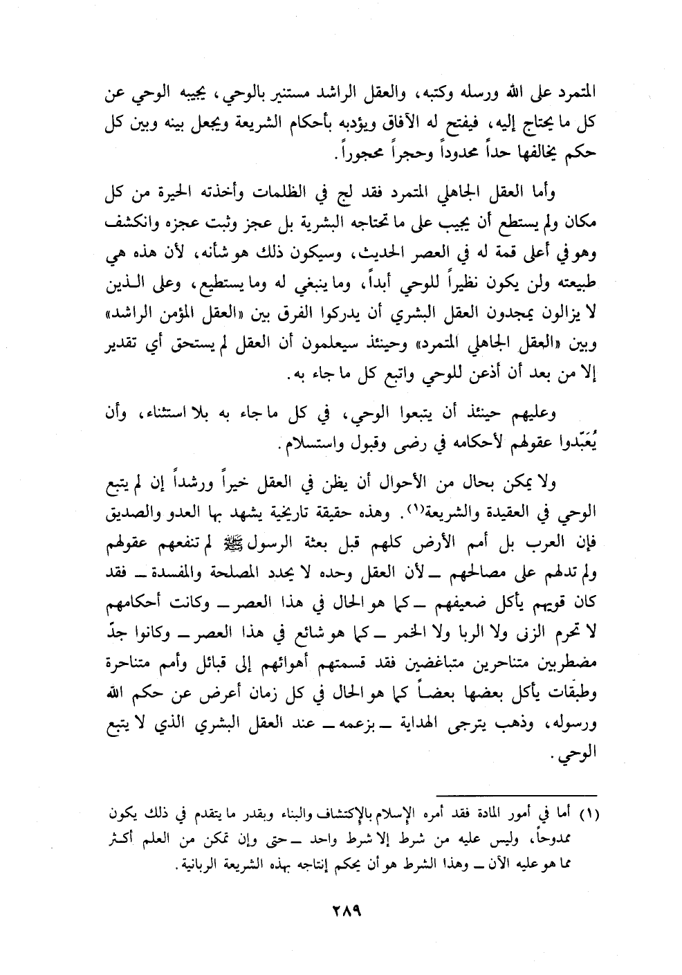 وأما العقل الجاهلي المتمرد فقد لج في الظلمات وأخذته الحيرة من كل وركان ولم يستطع أن يجيب على ما تحتاجه البشرية بل عجز وثبت عجزه وانكشف وهو في أعلى قمة له في العصر الحديث، وسيكون ذلك هو شأنه، لأن هذه هي طبيعته ولن يكون نظيراً للوحي أبداً، وما ينبغي له وما يستطيع، وعلى الذين لا يزالون يمجدون العقل البشري أن يدركوا الفرق بين "العقل المؤمن الراشد" وبين "العقل الجاهلي المتمرد" وحينئذ سيعلمون أن العقل لم يستحق أي تقدير إلا من بعد أن أذعن للوحي واتبع كل ما جاء به.