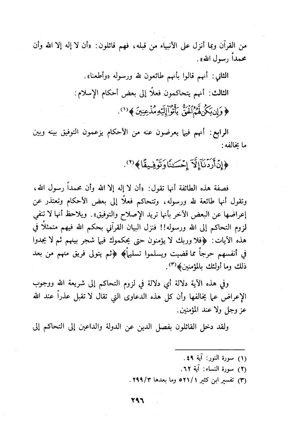 فصفة هذه الطائفة أنها تقول: "أن لا إله إلا الله وأن محمداً رسول الله، وتقول أنها طائعة لله ورسوله، وتتحاكم فعلاً إلى بعض الأحكام وتعتذر عن إعراضها عن البعض الآخر بأنها تريد الإِصلاح والتوفيق". ويلاحظ أنها لا تنفي لزوم التحاكم إلى الله ورسوله!! فنزل البيان القرآني بحكم الله فيهم متمثلاً في هذه الآيات: {فلا وربك لا يؤمنون حتى يحكموك فيما شجر بينهم ثم لا يجدوا في أنفسهم حرجاً مما قضيت ويسلموا تسليماً} {ثم يتولى فريق منهم من بعد ذلك وما أولئك بالمؤمنين} (٣).