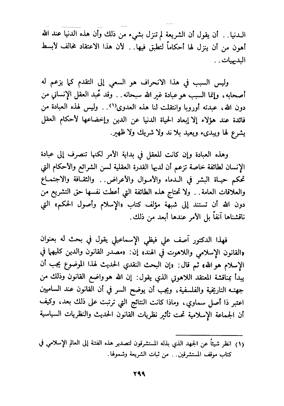 فهذا الدكتور آصف علي فيظي الإِسماعيلي يقول في بحث له بعنوان "القانون الإِسلامي واللاهوت في الهند" إن: "مصدر القانون والدين كليهما في الإِسلام هو الله" ثم قال: "إن البحث النقدي الحديث لهذا الموضوع يجب أن يبدأ بمناقشة المعتقد اللاهوتي الذي يقول: إن الله هو واضع القانون وذلك من جهته التاريخية والفلسفية، ويجب أن يوضح السر في أن القانون عند الساميين اعتبر ذا أصل سماوي، وماذا كانت النتائج التي ترتبت على ذلك بعد، وكيف أن الجماعة الإِسلامية تحت تأثير نظريات القانون الحديث والنظريات السياسية