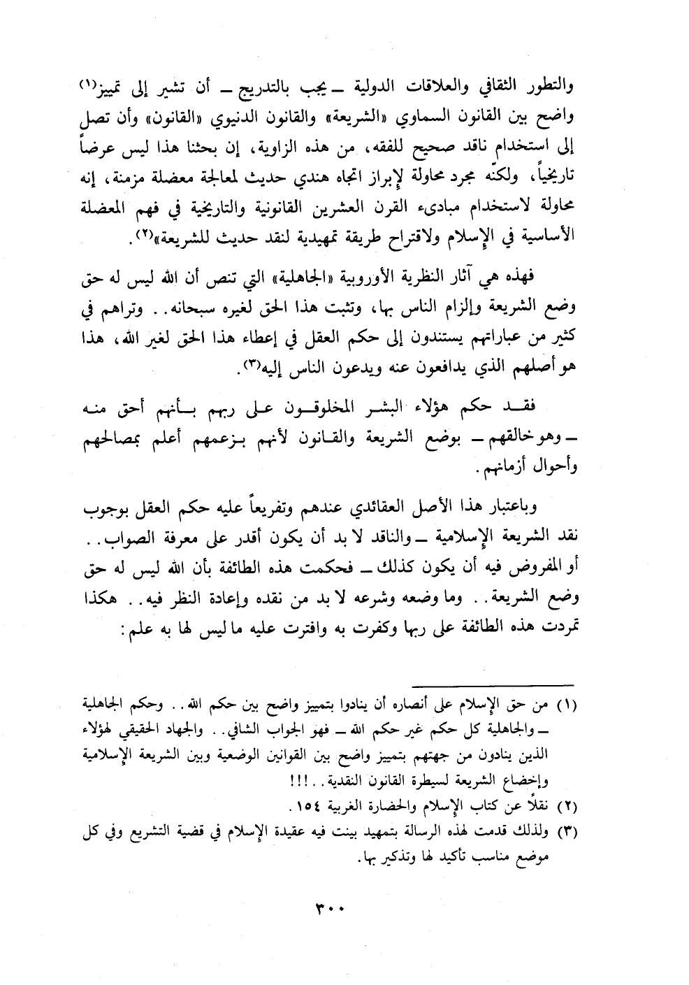 (١) من حق الإِسلام على أنصاره أن ينادوا بتمييز واضح بين حكم الله .. وحكم الجاهلية - والجاهلية كل حكم غير حكم الله - فهو الجواب الشافي .. والجهاد الحقيقي لهؤلاء الذين ينادون من جهتهم بتمييز واضح بين القوانين الوضعية وبين الشريعة الإِسلامية وإخضاع الشريعة لسيطرة القانون النقدية .. !!!
