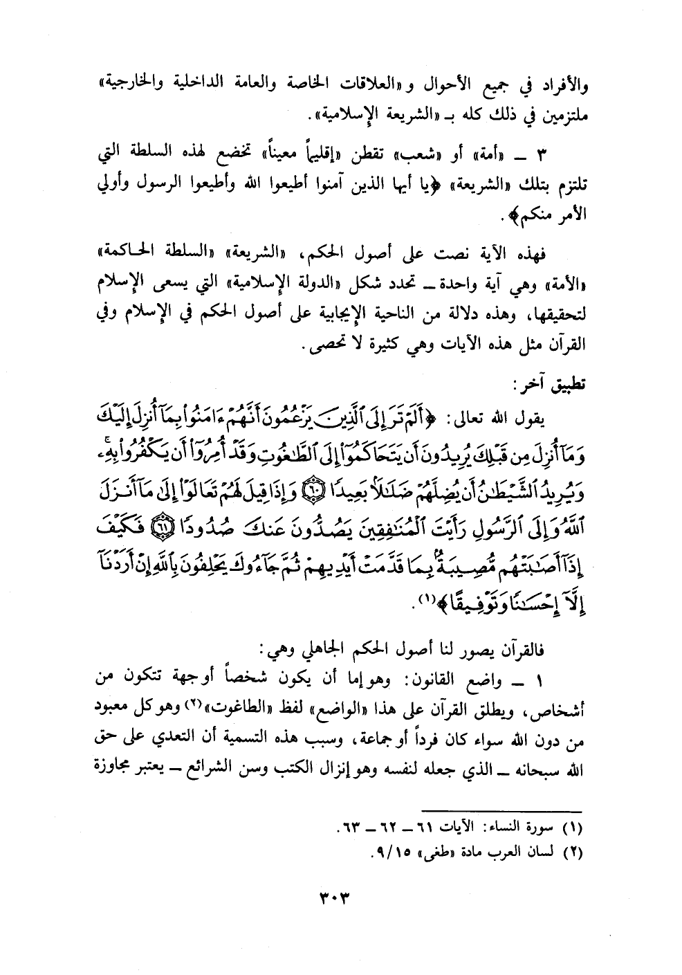 فهذه الآية نصت على أصول الحكم، "الشريعة" "السلطة الحاكمة" "الأمة" وهي آية واحدة -تحدد شكل "الدولة الإِسلامية" التي يسعى الإِسلام لتحقيقها، وهذه دلالة من الناحية الإِيجابية على أصول الحكم في الإِسلام وفي القرآن مثل هذه الآيات وهي كثيرة لا تحصى.