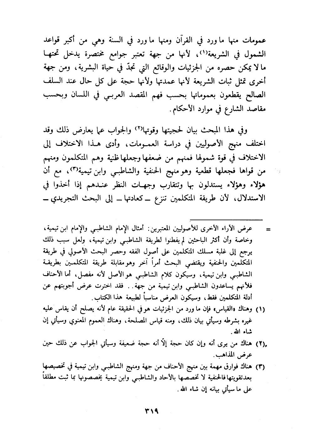 = عرض الآراء الأخرى للأصوليين المعتبرين: أمثال الإِمام الشاطبي والإمام ابن تيمية، وخاصة وأن أكثر الباحثين لم يفطنوا لطريقة الشاطبي وابن تيمية، ولعل سبب ذلك يرجع إلى غلبة مسلك المتكلمين على أصول الفقه وحصر البحث الأصولي في طريقة المتكلمين والحنفية ويقتضي البحث أمرًا آخر وهو مقابلة طريقة المتكلمين بطريقة الشاطبي وابن تيمية، وسيكون كلام الشاطبي هو الأصل لأنه مفصل، أما الأحناف فلأنهم يساعدون الشاطبي وابن تيمية من جهة .. فقد اخترت عرض أجوبتهم عن أدلة المتكلمين فقط، وسيكون العرض مناسبًا لطبيعة هذا الكتاب.