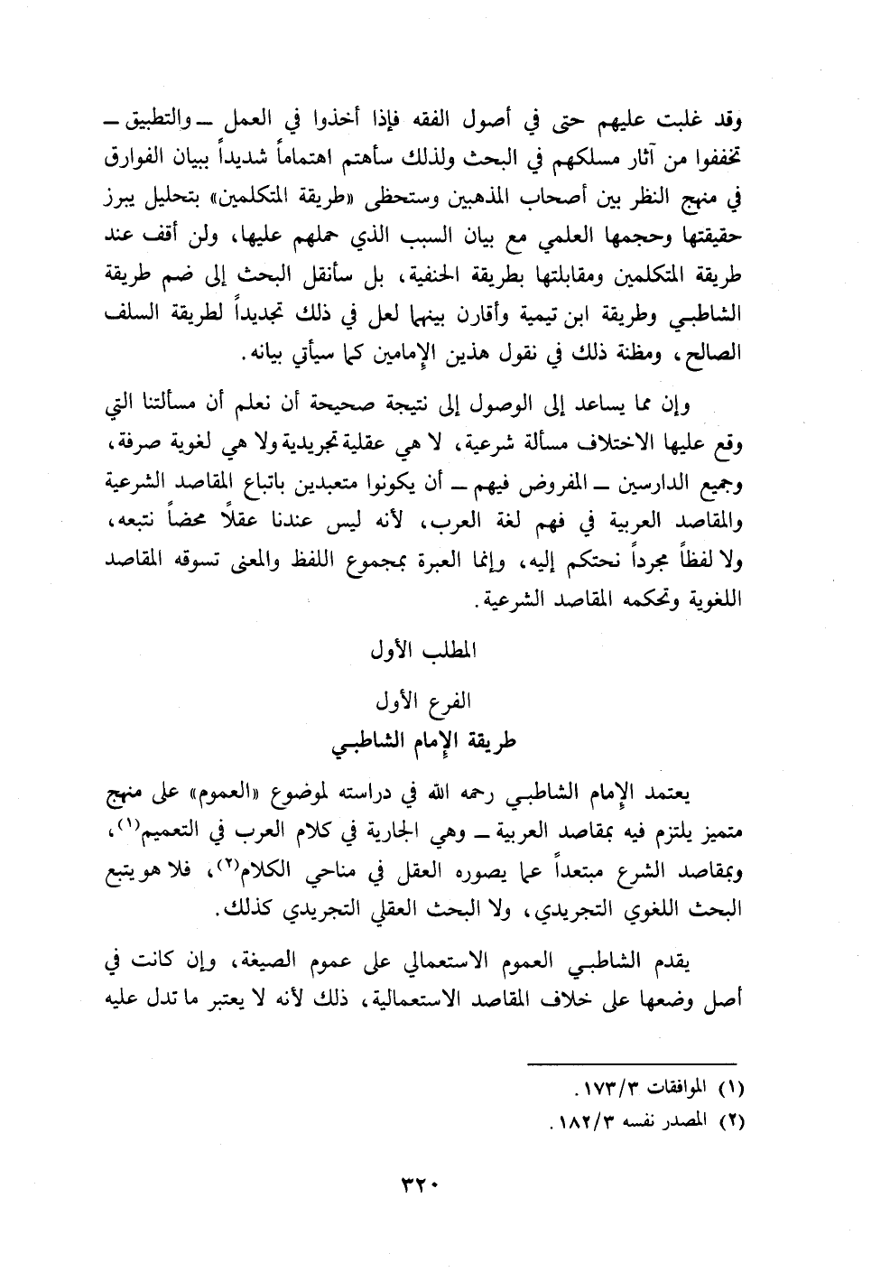 وقد غلبت عليهم حتى في أصول الفقه فإذا أخذوا في العمل -والتطبيق- تخففوا من آثار مسلكهم في البحث ولذلك سأهتم اهتماماً شديدًا ببيان الفوارق في منهج النظر بين أصحاب المذهبين وستحظى "طريقة المتكلمين" بتحليل يبرز حقيقتها وحجمها العلمي مع بيان السبب الذي حملهم عليها، ولن أقف عند طريقة المتكلمين ومقابلتها بطريقة الحنفية، بل سأنقل البحث إلى ضم طريقة الشاطبي وطريقة ابن تيمية وأقارن بينهما لعل في ذلك تجديدًا لطريقة السلف الصالح، ومظنة ذلك في نقول هذين الإِمامين كما سيأتي بيانه.