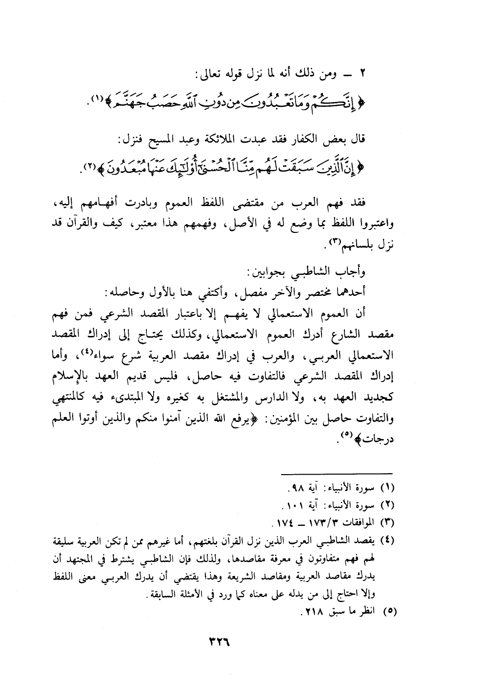 (٤) يقصد الشاطبي العرب الذين نزل القرآن بلغتهم، أما غيرهم ممن لم تكن العربية سليقة لهم فهم متفاوتون في معرفة مقاصدها، ولذلك فإن الشاطبي يشترط في المجتهد أن يدرك مقاصد العربية ومقاصد الشريعة وهذا يقتضي أن يدرك العربي معنى اللفظ وإلا احتاج إلى من يدله على معناه كما ورد في الأمثلة السابقة.