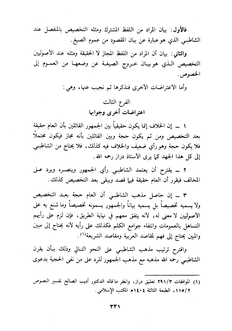 (١) الموافقات ٣/ ٢٩١ تعليق دراز، وانظر ما قاله الدكتور أديب الصالح تفسير النصوص ٢/ ١١٥، الطبعة الثالثة ١٤٠٤ هـ المكتب الإِسلامي.