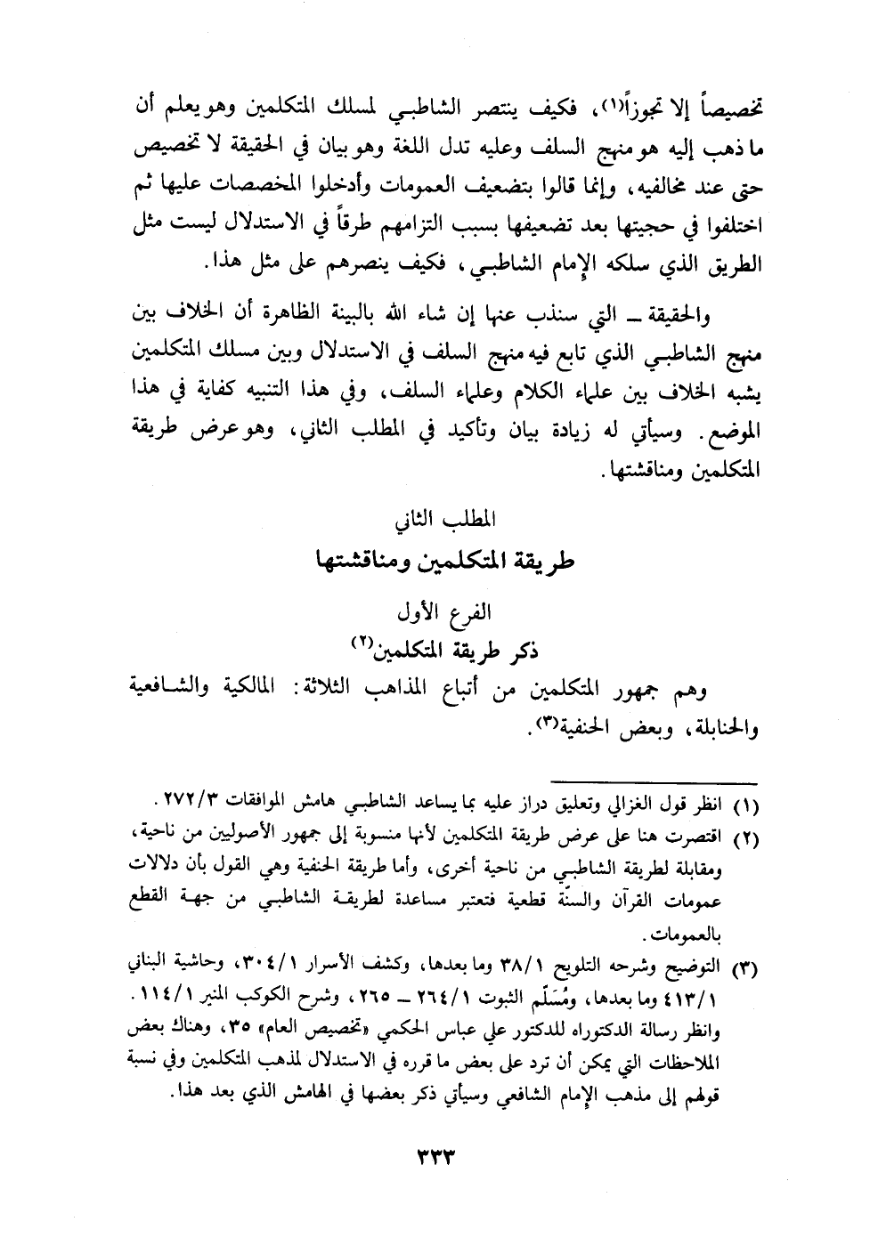 والحقيقة -التي سنذب عنها إن شاء الله بالبينة الظاهرة أن الخلاف بين منهج الشاطبي الذي تابع فيه منهج السلف في الاستدلال وبين مسلك المتكلمين يشبه الخلاف بين علماء الكلام وعلماء السلف، وفي هذا التنبيه كفاية في هذا الموضع. وسيأتي له زيادة بيان وتأكيد في المطلب الثاني، وهو عرض طريقة المتكلمين ومناقشتها.