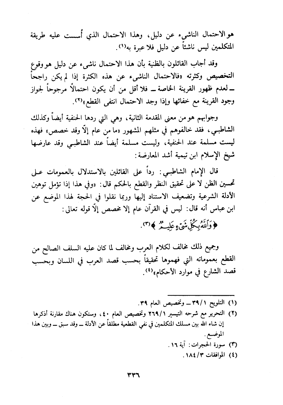 (٢) التحرير مع شرحه التيسير ١/ ٢٦٩ وتخصيص العام ٤٠، وستكون هناك مقارنة أذكرها إن شاء الله بين مسلك المتكلمين في نفي القطعية مطلقًا عن الأدلة -وقد سبق- وبين هذا الموضع.