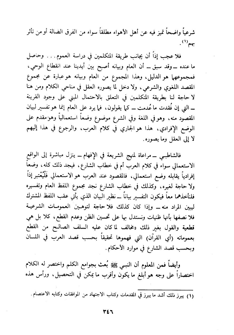 فلا عجب إذًا أن يجانب طريقة المتكلمين في دراسة العموم ... وحاصل ما عنده -وقد سبق- أن العام وبيانه أصبح بين أيدينا عند انقطاع الوحي، فمجموعهما هو الدليل، وهذا المجموع من العام وبيانه هو عبارة عن مجموع المقصد اللغوي والشرعي، ولا دخل لما يصوره العقل في مناحي الكلام ومن هنا لا حاجة لنا بطريقة المتكلمين في التعلق بالاحتمال المبني على وجود القرينة -التي إن فُقدت ما عُدمت- كما يقولون، فما يرد على العام إنما هو تفسير لبيان المقصود منه، وهو في اللغة وفي الشرع موضوع وضعًا استعماليًا وهو مقدم على الوضع الإِفرادي، هذا هو الجاري في كلام العرب، والرجوع في هذا إليهم لا إلى العقل وما يصوره.