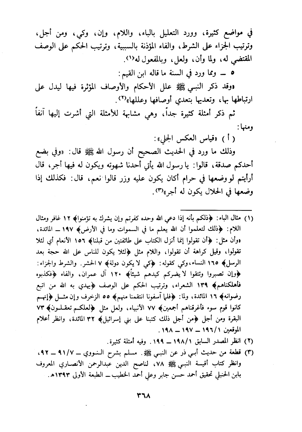 (١) مثال الباء: {ذَلِكُمْ بِأَنَّهُ إِذَا دُعِيَ اللَّهُ وَحْدَهُ كَفَرْتُمْ وَإِنْ يُشْرَكْ بِهِ تُؤْمِنُوا} غافر ومثال اللام: {ذَلِكَ لِتَعْلَمُوا أَنَّ اللهَ يَعْلَمُ مَا فِي السَّمَاوَاتِ وَمَا فِي الْأَرْضِ} ١٩٧ - المائدة، "وأن مثل: {أَنْ تَقُولُوا إِنَّمَا أُنْزِلَ الْكِتَابُ عَلَى طَائِفَتَيْنِ مِنْ قَبْلِنَا} ١٥٦ الأنعام أي لئلا تقولوا، وقيل كراهة أن تقولوا، واللام مثل {لِئَلَّا يَكُونَ لِلنَّاسِ عَلَى اللهِ حُجَّةٌ بَعْدَ الرُّسُلِ} ١٦٥ النساء، وكي كقوله: {كَيْ لَا يَكُونَ دُولَةً} ٧ الحشر. والشرط والجزاء: {وَإِنْ تَصْبِرُوا وَتَتَّقُوا لَا يَضُرُّكُمْ كَيْدُهُمْ شَيْئًا} ١٢٠ آل عمران، والفاء {فَكَذَّبُوهُ فَأَهْلَكْنَاهُمْ} ١٣٩ الشعراء، وترتيب الحكم على الوصف {يَهْدِي بِهِ اللَّهُ مَنِ اتَّبَعَ رِضْوَانَهُ} ١٦ المائدة، ولما: {فَلَمَّا آسَفُونَا انْتَقَمْنَا مِنْهُمْ} ٥٥ الزخرف وإن مثل {كَانُوا قَوْمَ سَوْءٍ فَأَغْرَقْنَاهُمْ أَجْمَعِينَ} ٧٧ الأنبياء، ولعل مثل {لَعَلَّكُمْ تَعْقِلُونَ} ٧٣ البقرة ومن أجل {مِنْ أَجْلِ ذَلِكَ كَتَبْنَا عَلَى بَنِي إِسْرَائِيلَ} ٣٢ المائدة، وانظر أعلام الموقعين ١/ ١٩٦ - ١٩٧ - ١٩٨.