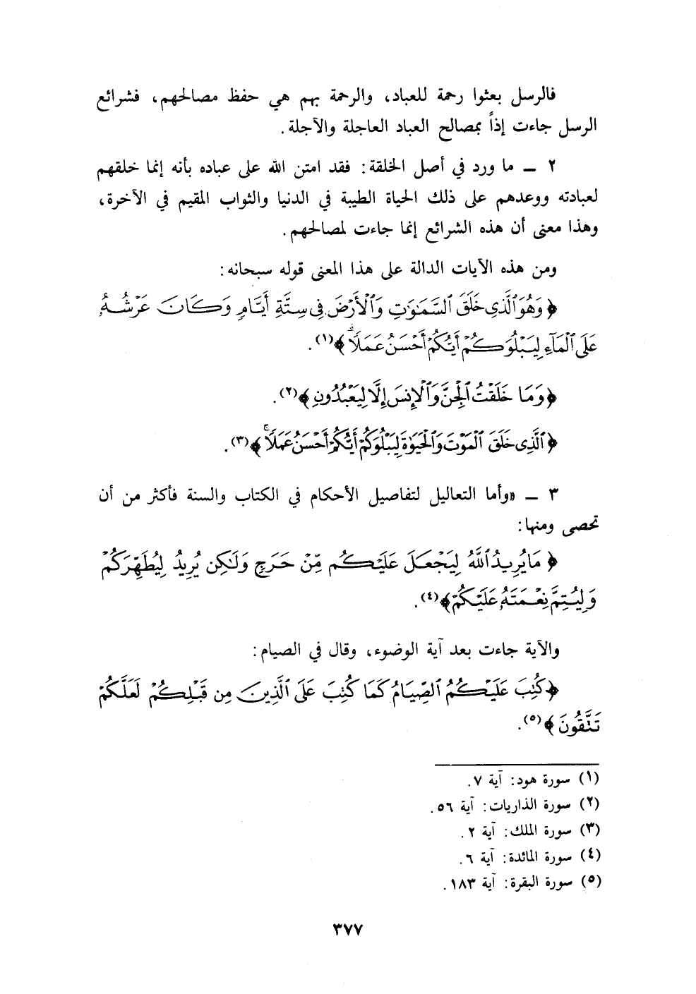 ٢ - ما ورد في أصل الخلقة: فقد امتن الله على عباده بأنه إنما خلقهم لعبادته ووعدهم على ذلك الحياة الطيبة في الدنيا والثواب المقيم في الآخرة، وهذا معنى أن هذه الشرائع إنما جاءت لمصالحهم.