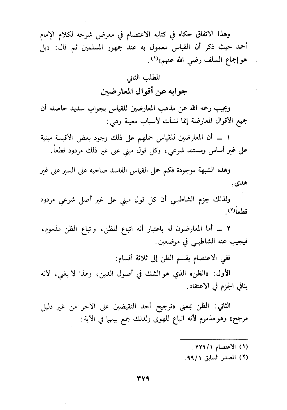 وهذا الاتفاق حكاه في كتابه الاعتصام في معرض شرحه لكلام الإِمام أحمد حيث ذكر أن القياس معمول به عند جمهور المسلمين ثم قال: "بل هو إجماع السلف - رضي الله عنهم -" (١).